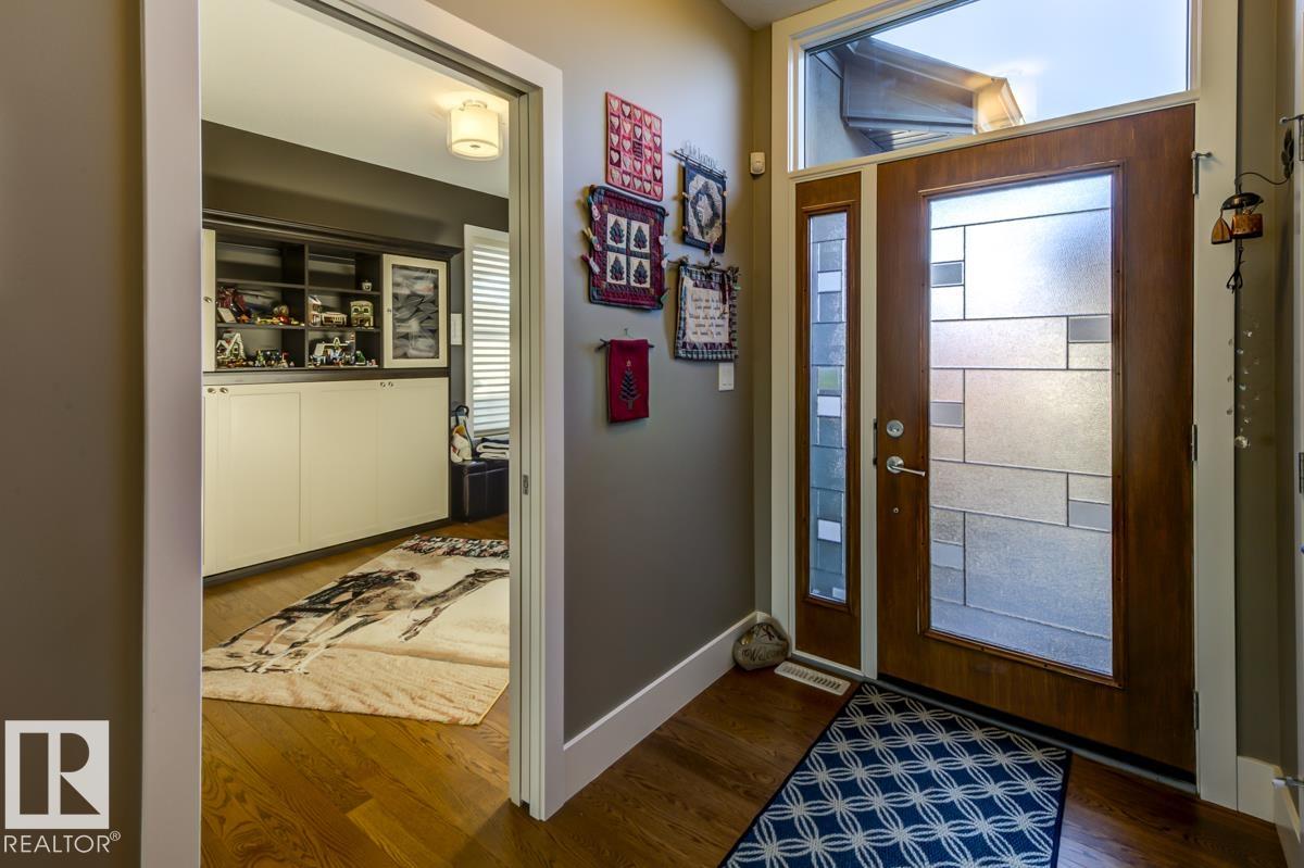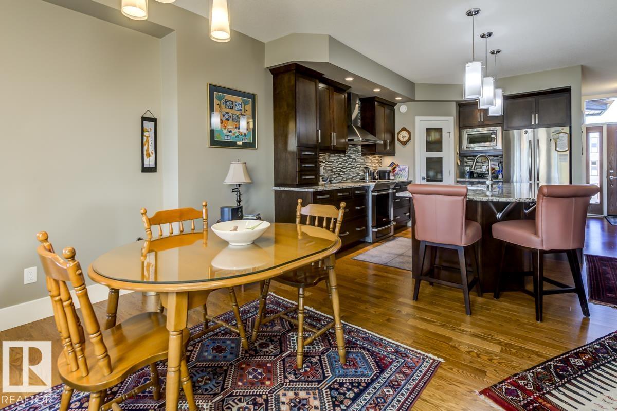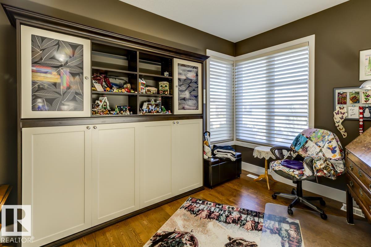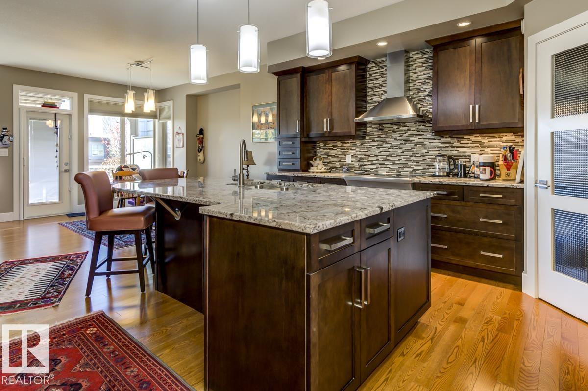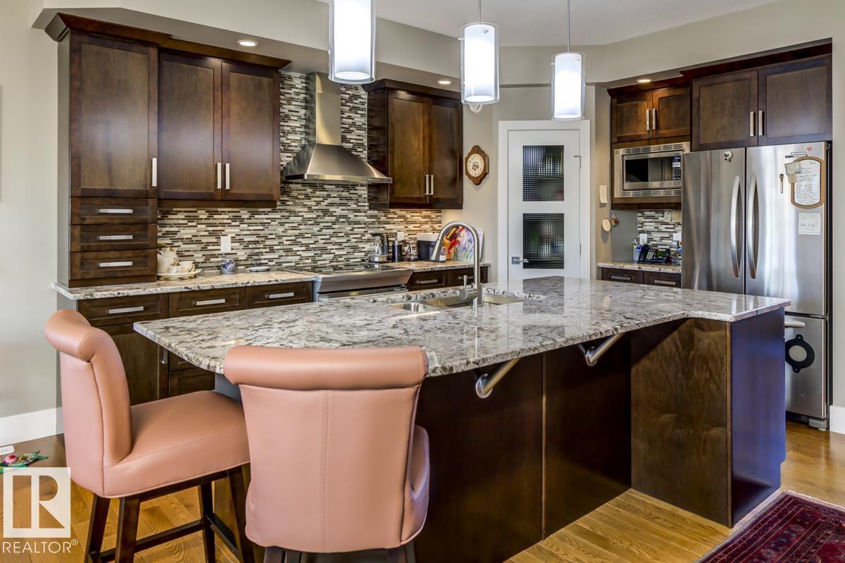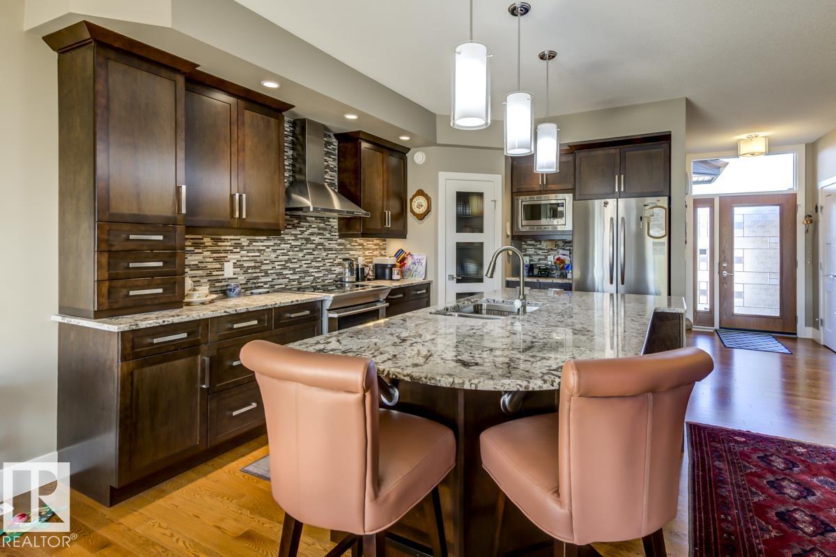 Welcome to this stunning bungalow in the sought-after and prestigious community of Larch Park in Mactaggart, perfectly situated on a quiet cul-de-sac. Thoughtfully designed for comfort and style, this residence features 9-foot ceilings on both levels, a main floor office with a Murphy bed, and a modern kitchen boasting granite counters, stainless steel appliances, pantry, and an oversized island?ideal for entertaining. Enjoy the warmth of gas fireplaces in both the living and rec rooms, or unwind in the west-facing, landscaped backyard with exposed aggregate patio and extendable awning for customizable shade. The primary suite offers a spa-like 5-piece ensuite and walk-in closet, while the fully finished basement impresses with an oversized rec room with wet bar, two generous bedrooms, and ample storage. Additional highlights include main floor laundry, a double attached garage with extra depth, and Green Built certification for energy efficiency. With no condo fees, no shovelling, and no lawn care.