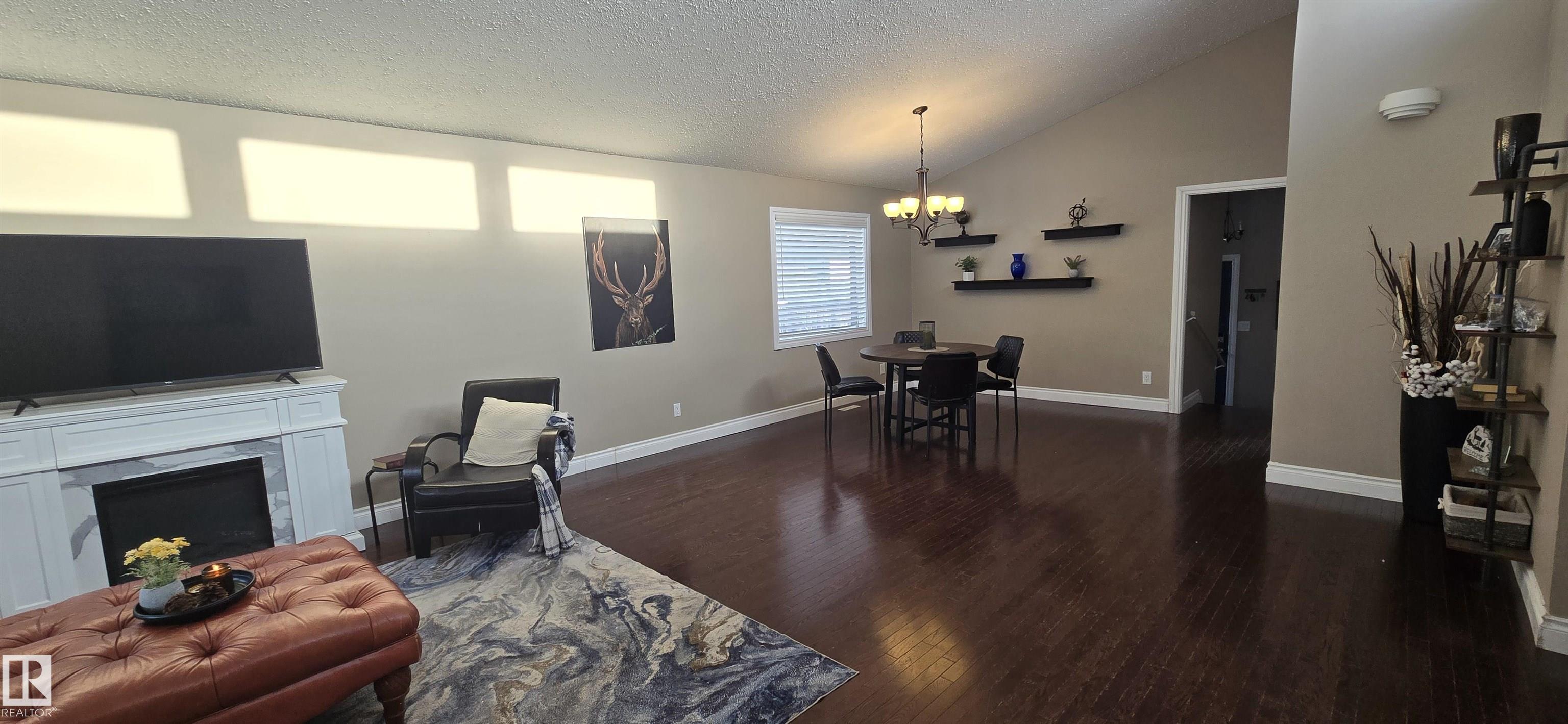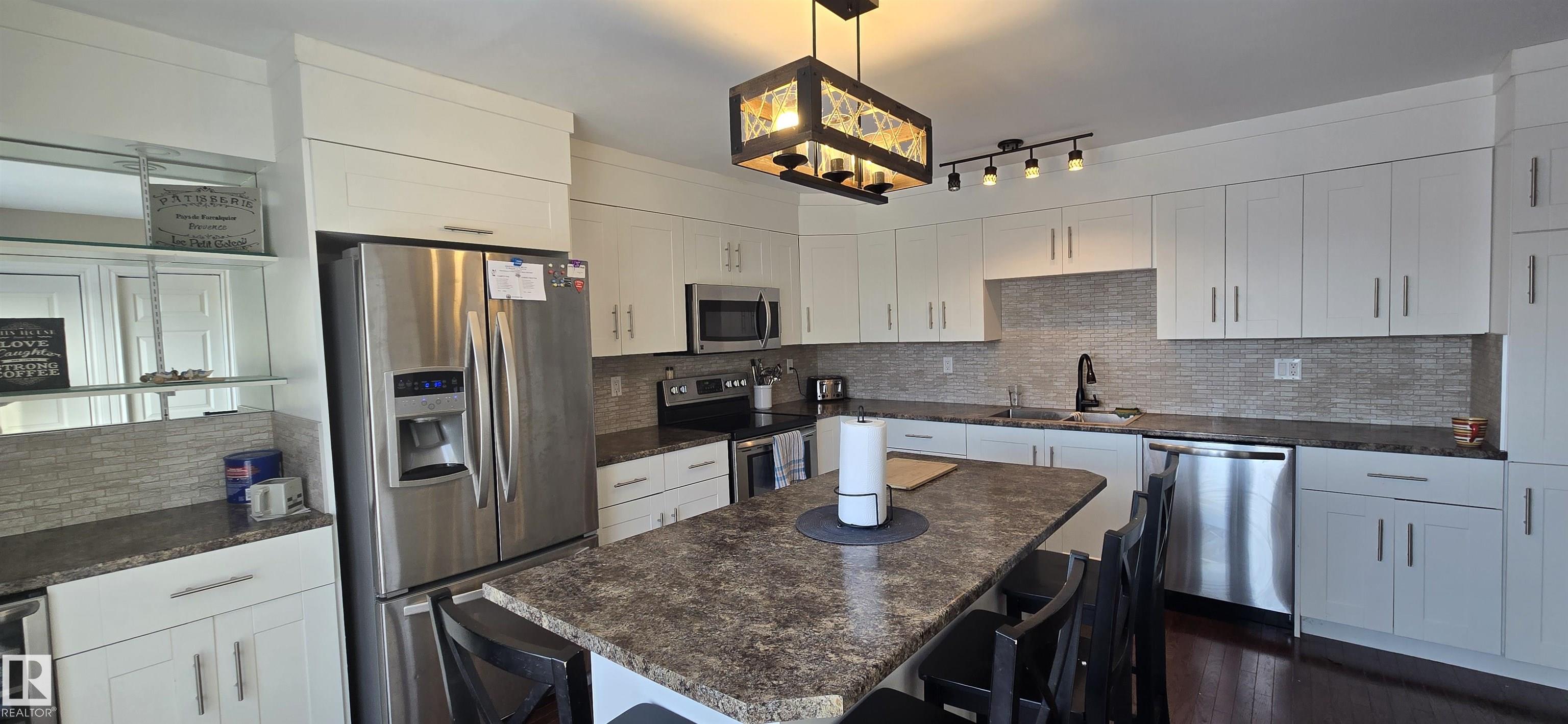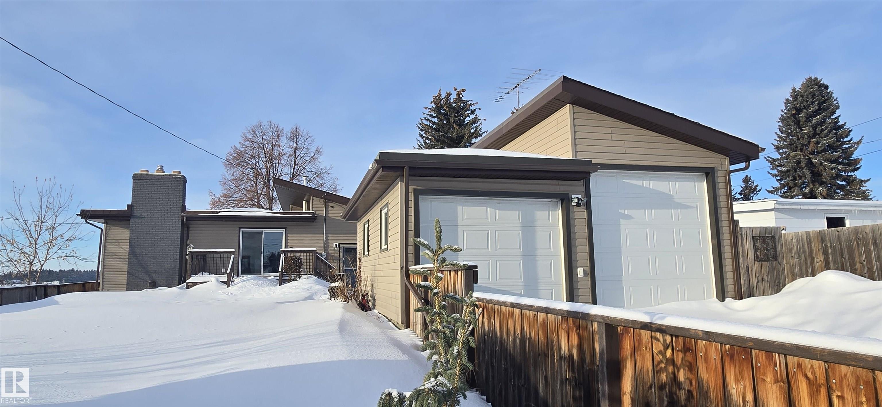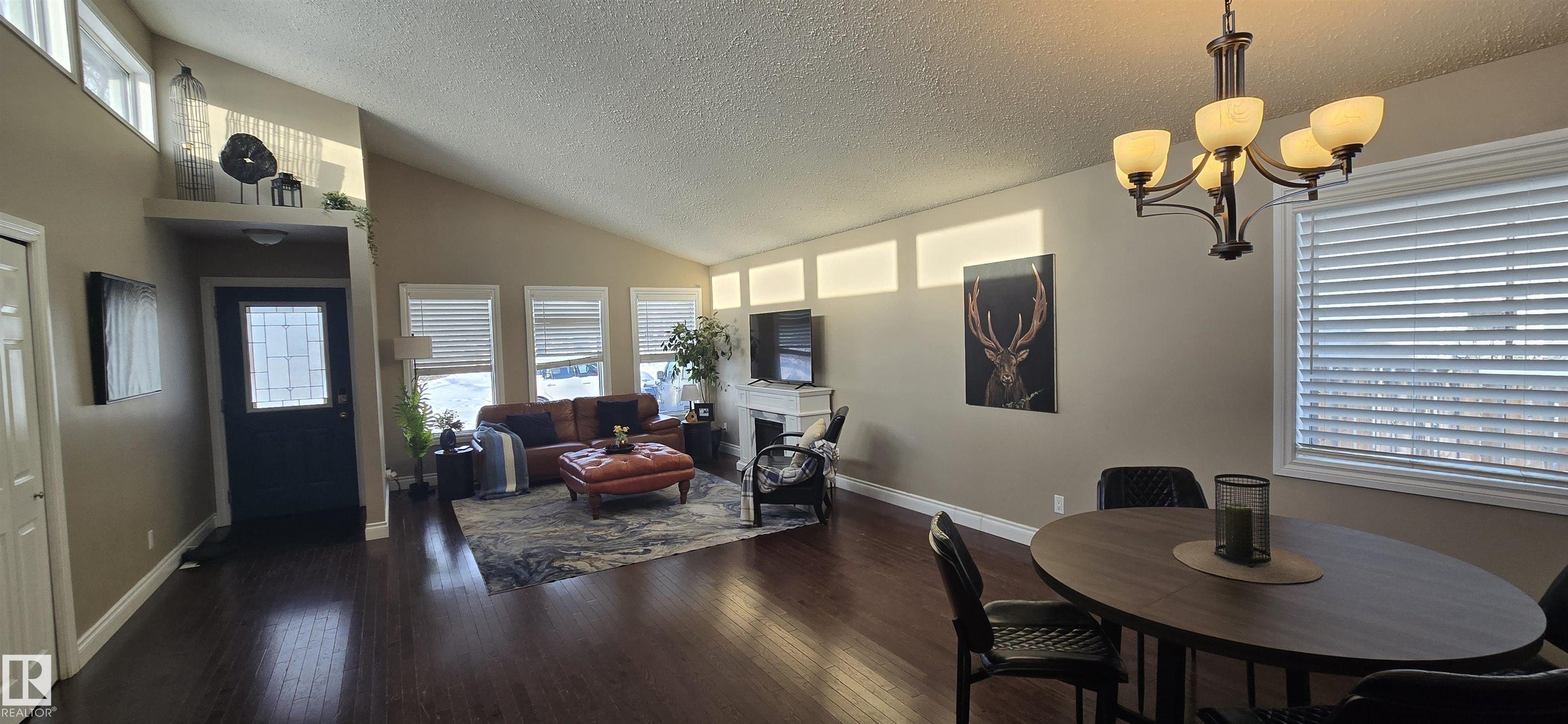 Spacious 5-bedroom family home on Vegreville's desirable south side, with stunning country views from the living room windows. Enjoy an open-concept living & dining area with vaulted ceilings, hardwood floors, and bright natural light?perfect for family gatherings. The modern kitchen offers stainless steel appliances, a large center island, coffee/bar nook, and direct access to the back deck.Main floor features two large bedrooms: primary with ensuite & walk-in closet; second with country views & cozy fireplace. Plus a beautiful main bath with tiled walk-in shower, spacious back entry, and 2-pc powder room. The finished basement includes three good-sized bedrooms, a large family room, 2-pc bath, laundry, and office area.Set on a fully landscaped 8,498 sq ft lot with double detached garage, front & rear drive access, RV parking, and room for outdoor enthusiasts.