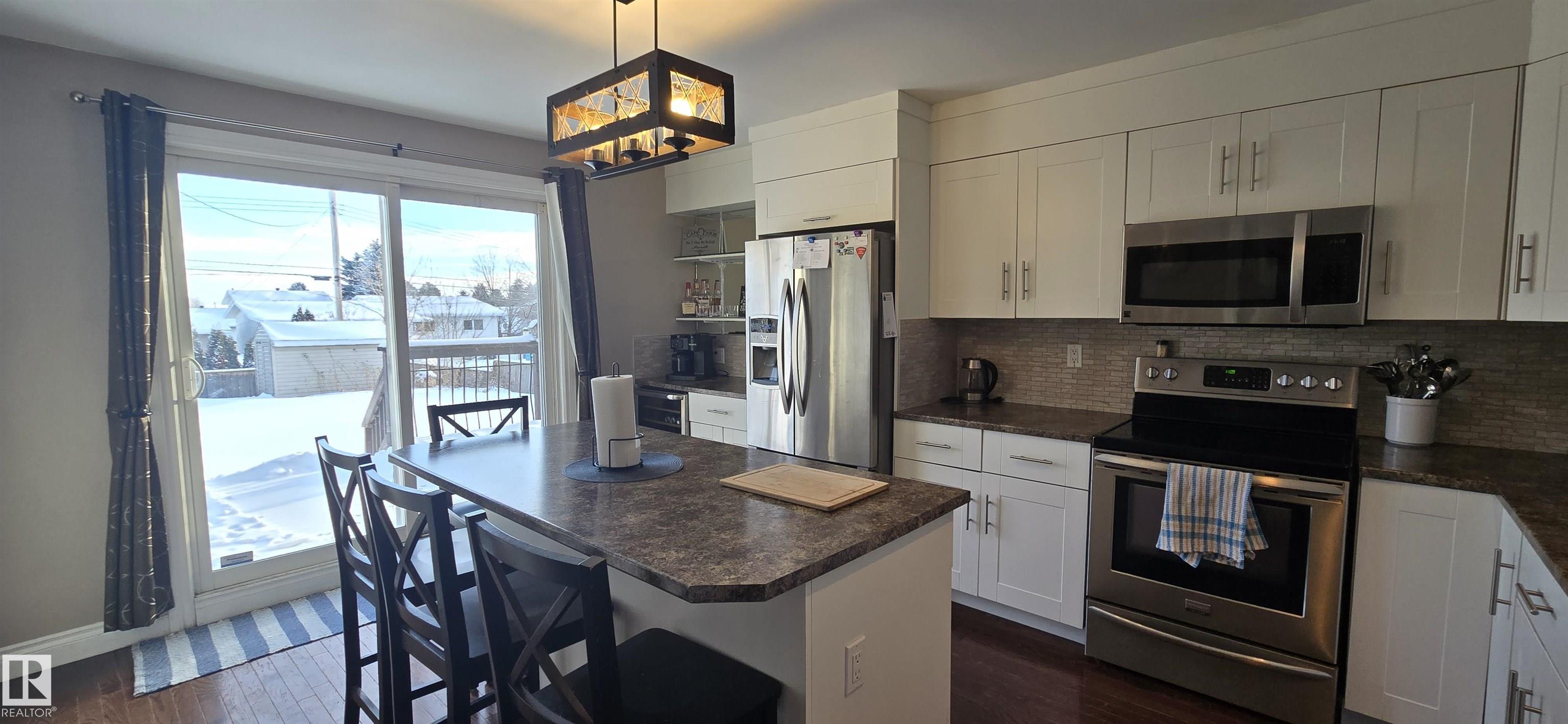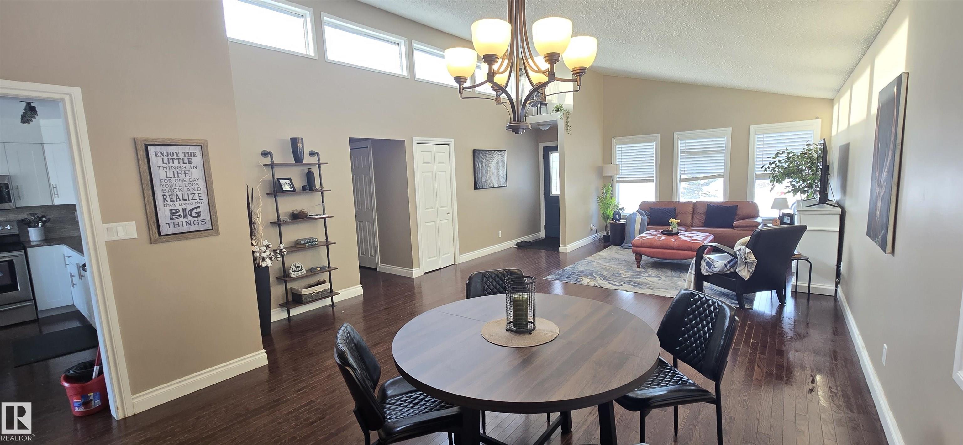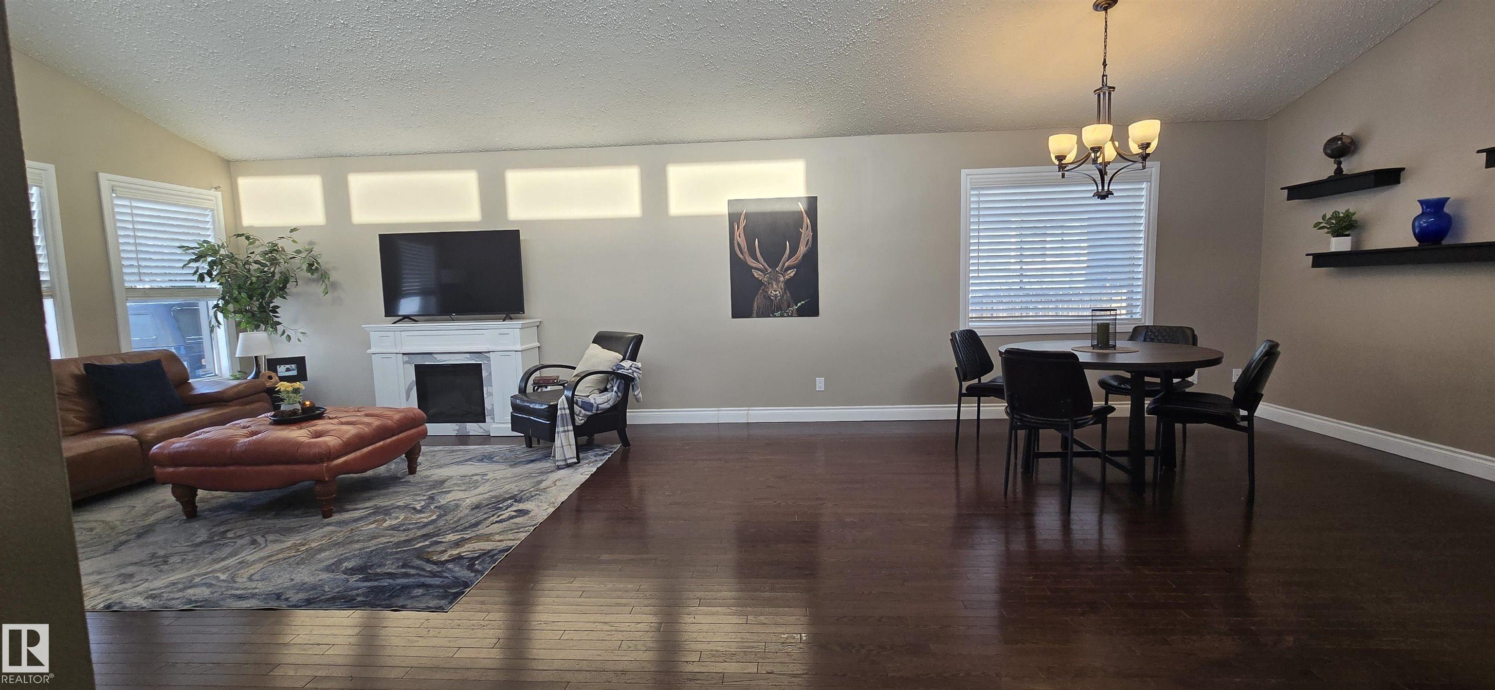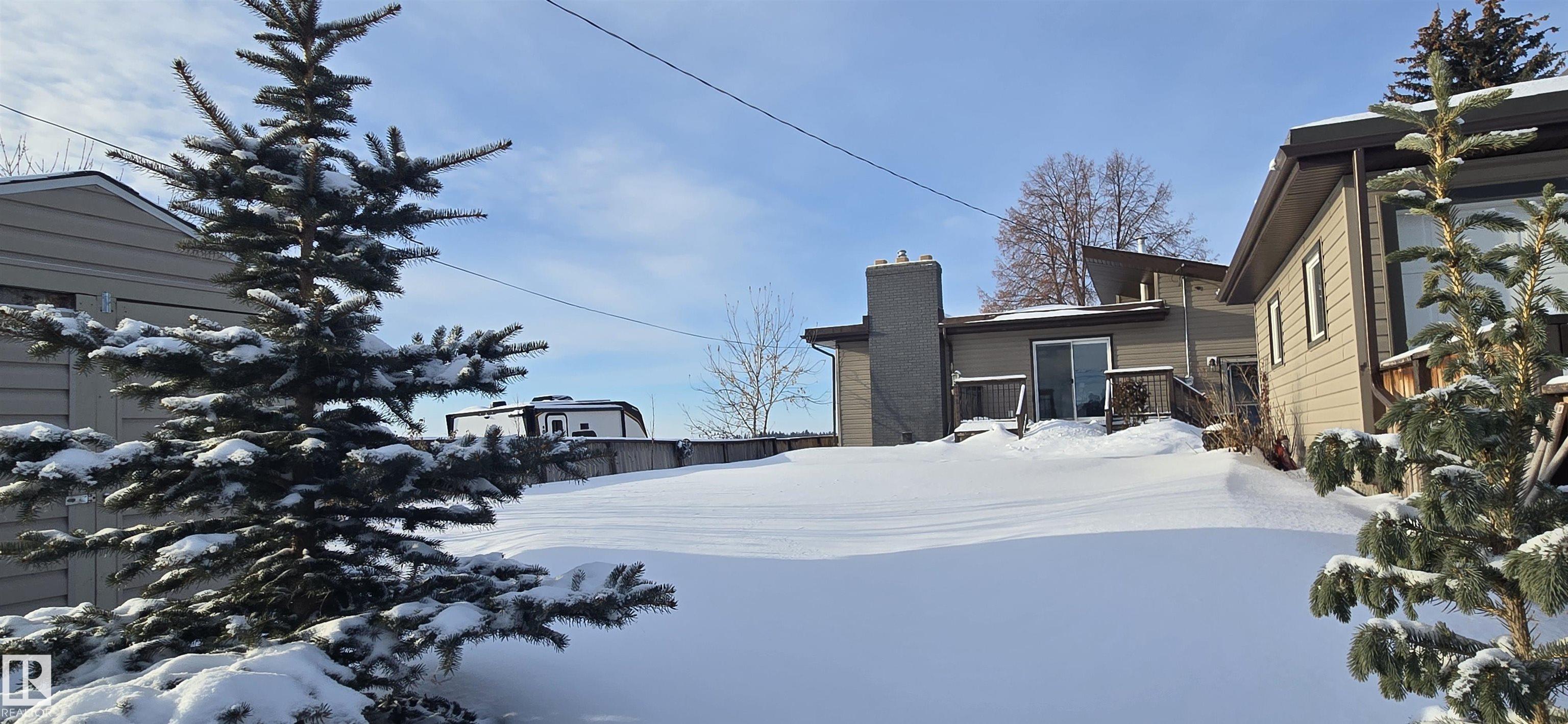 Spacious 5-bedroom family home on Vegreville's desirable south side, with stunning country views from the living room windows. Enjoy an open-concept living & dining area with vaulted ceilings, hardwood floors, and bright natural light?perfect for family gatherings. The modern kitchen offers stainless steel appliances, a large center island, coffee/bar nook, and direct access to the back deck.Main floor features two large bedrooms: primary with ensuite & walk-in closet; second with country views & cozy fireplace. Plus a beautiful main bath with tiled walk-in shower, spacious back entry, and 2-pc powder room. The finished basement includes three good-sized bedrooms, a large family room, 2-pc bath, laundry, and office area.Set on a fully landscaped 8,498 sq ft lot with double detached garage, front & rear drive access, RV parking, and room for outdoor enthusiasts.