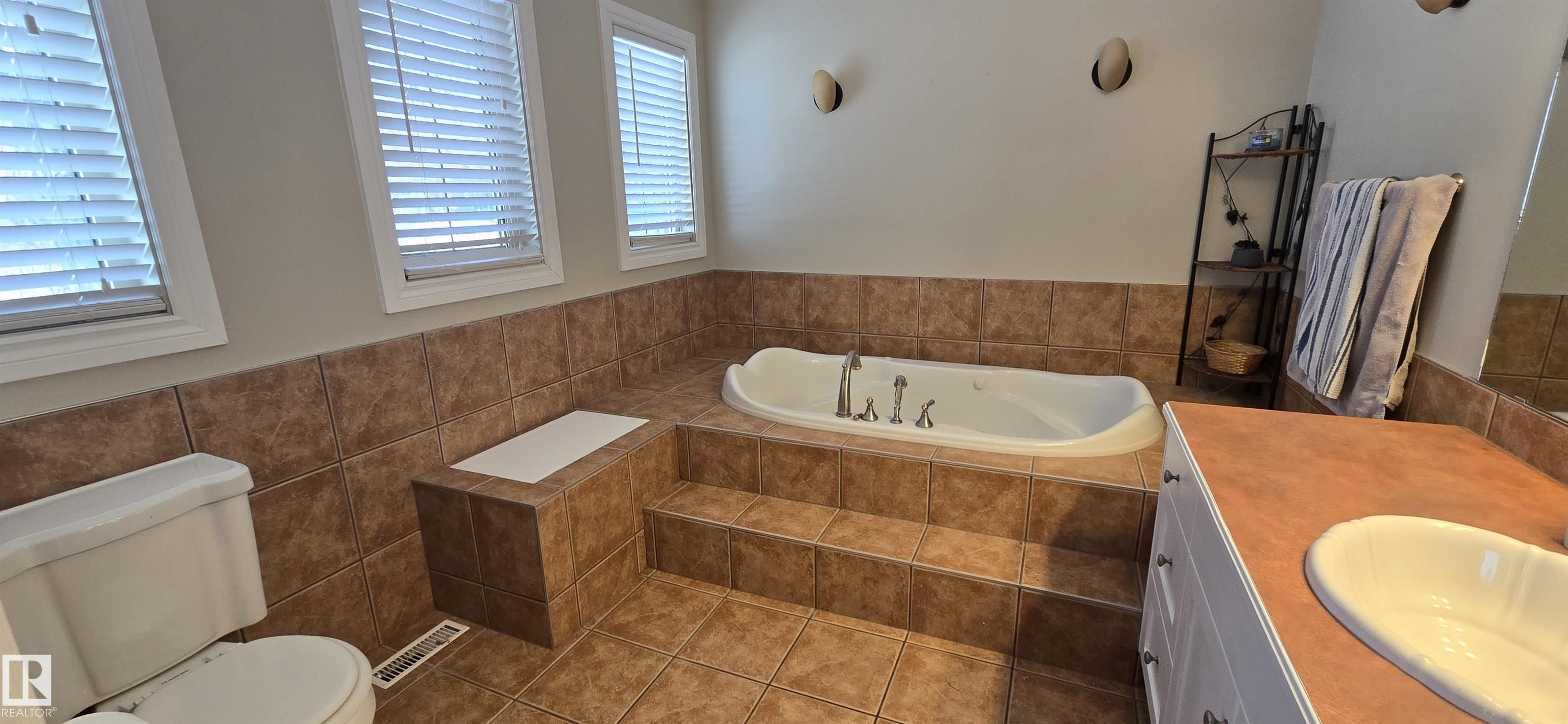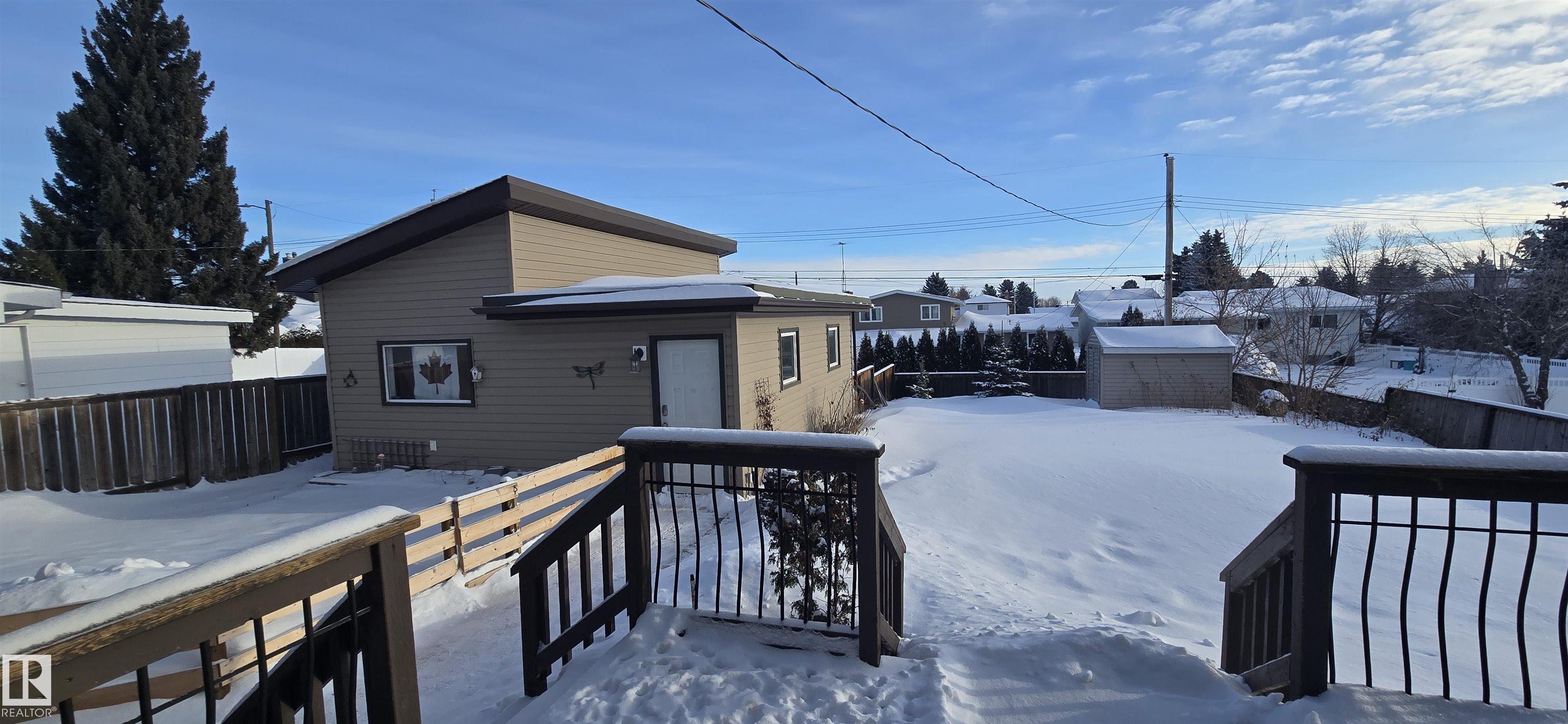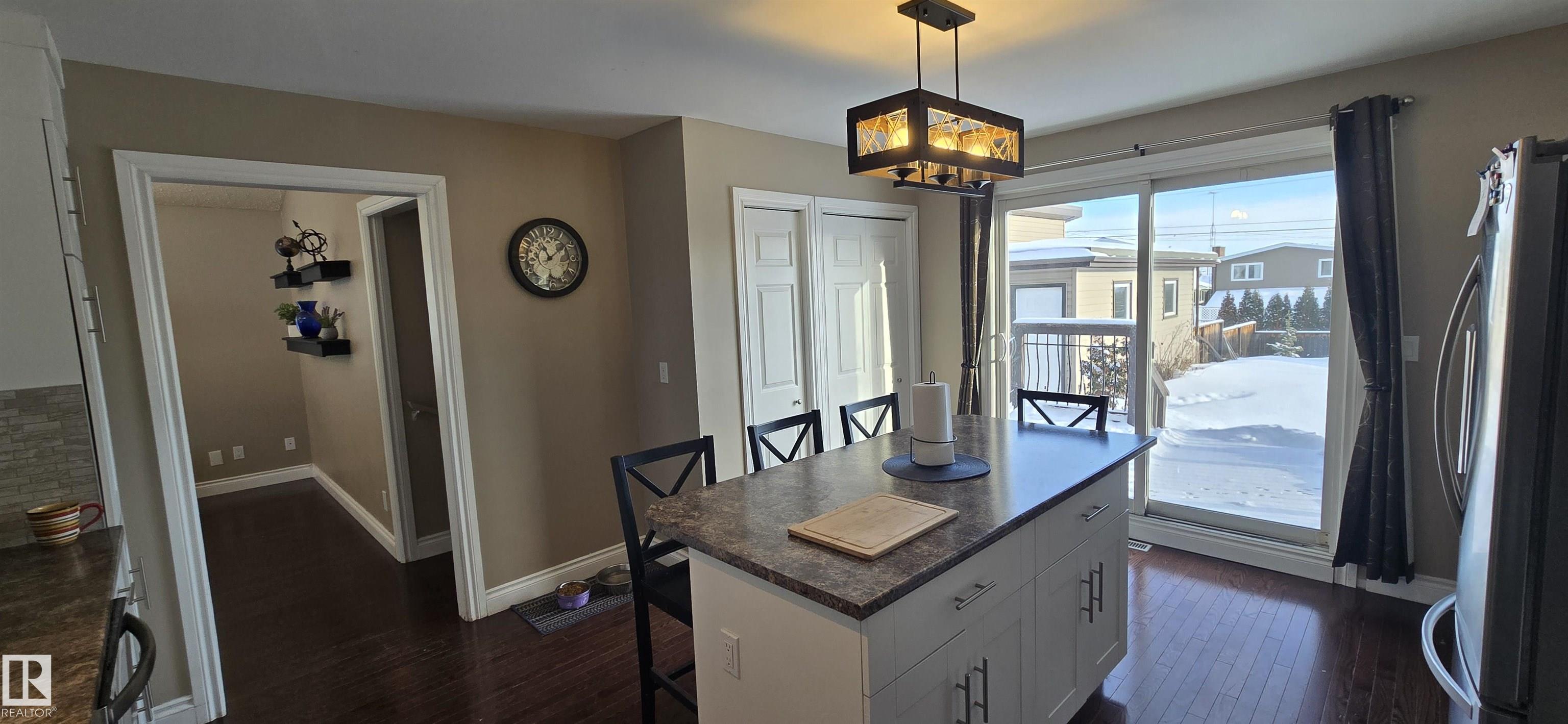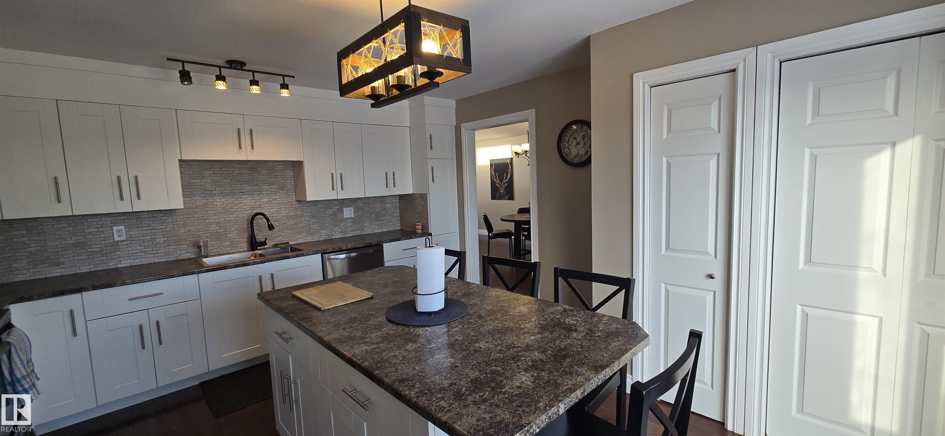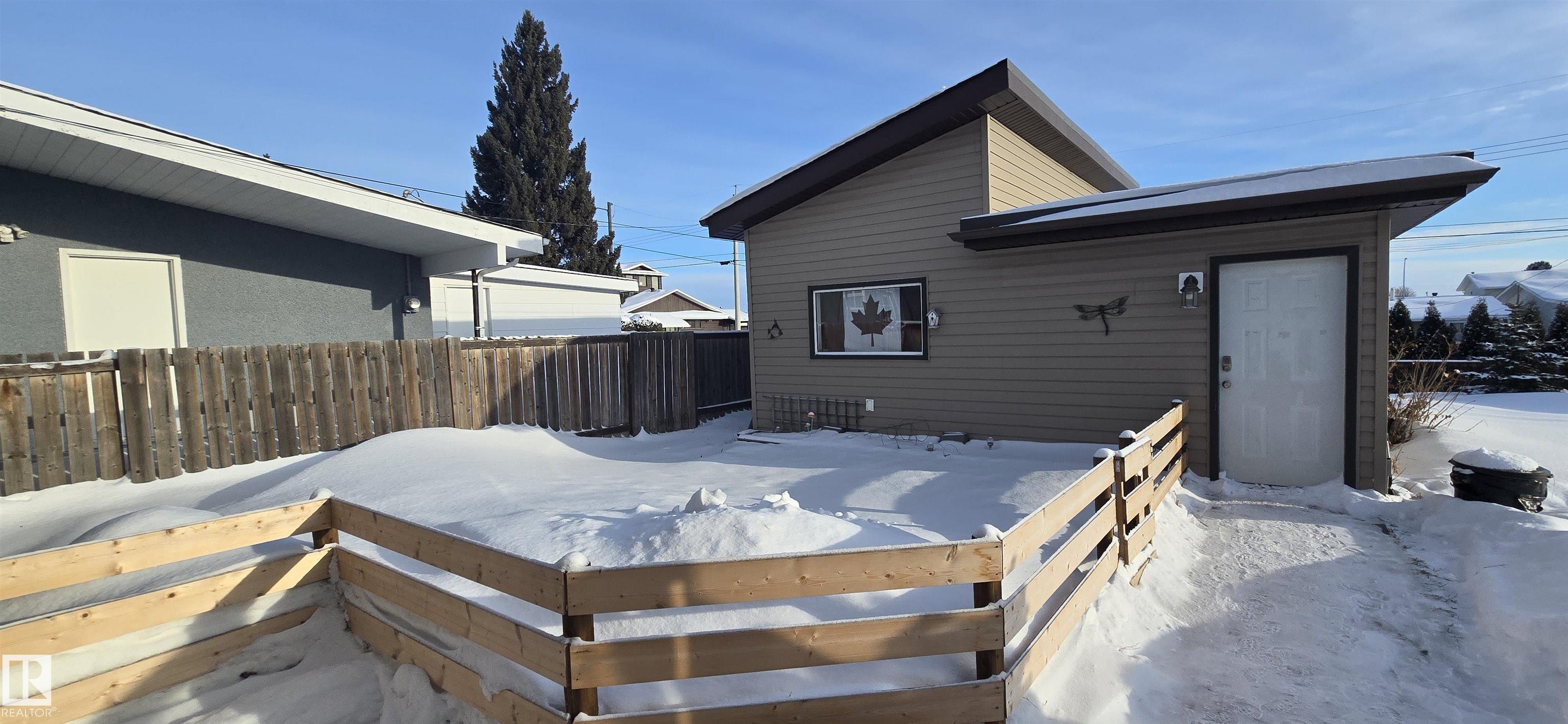 Spacious 5-bedroom family home on Vegreville's desirable south side, with stunning country views from the living room windows. Enjoy an open-concept living & dining area with vaulted ceilings, hardwood floors, and bright natural light?perfect for family gatherings. The modern kitchen offers stainless steel appliances, a large center island, coffee/bar nook, and direct access to the back deck.Main floor features two large bedrooms: primary with ensuite & walk-in closet; second with country views & cozy fireplace. Plus a beautiful main bath with tiled walk-in shower, spacious back entry, and 2-pc powder room. The finished basement includes three good-sized bedrooms, a large family room, 2-pc bath, laundry, and office area.Set on a fully landscaped 8,498 sq ft lot with double detached garage, front & rear drive access, RV parking, and room for outdoor enthusiasts.