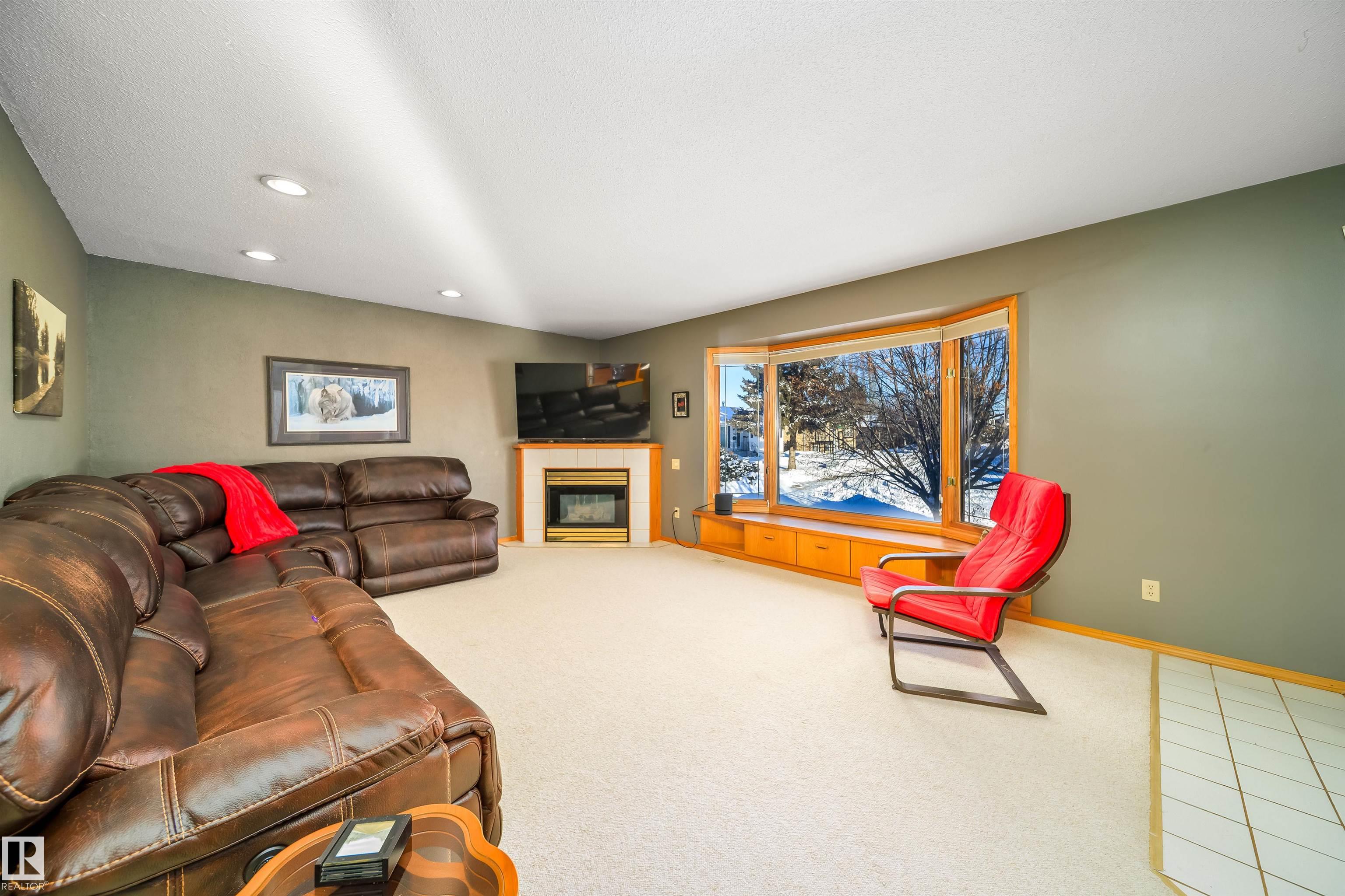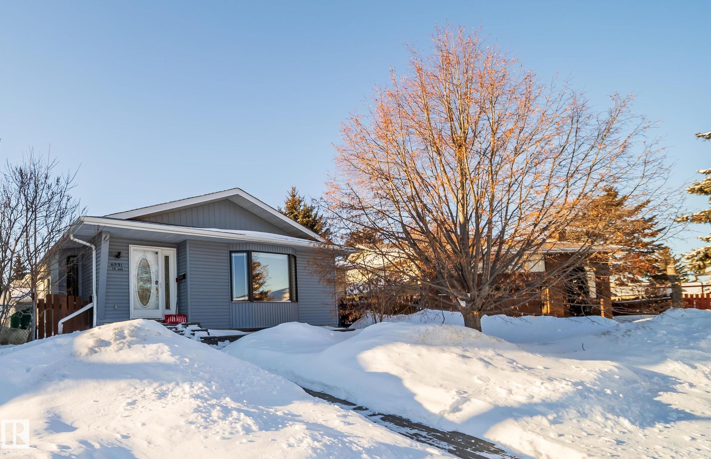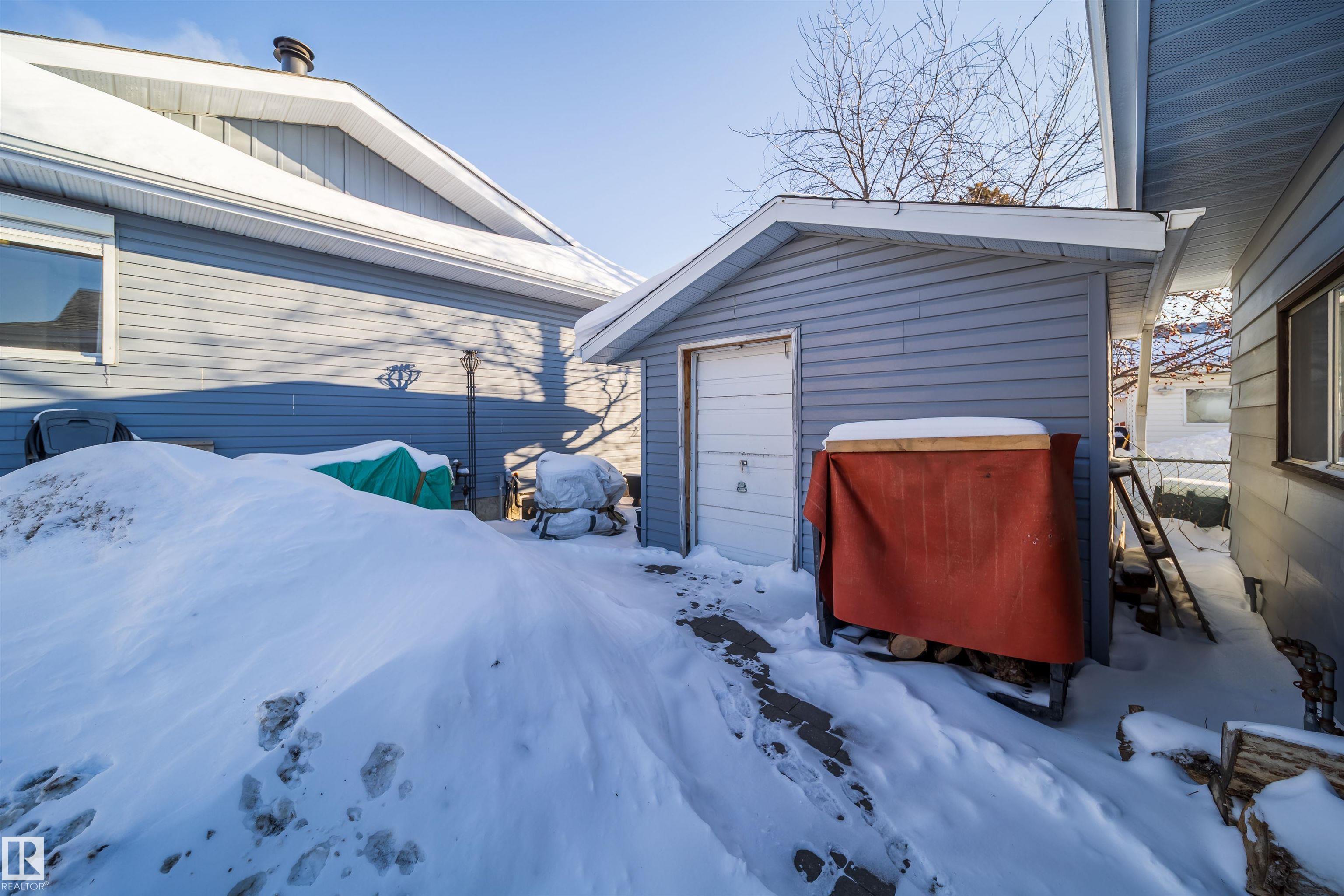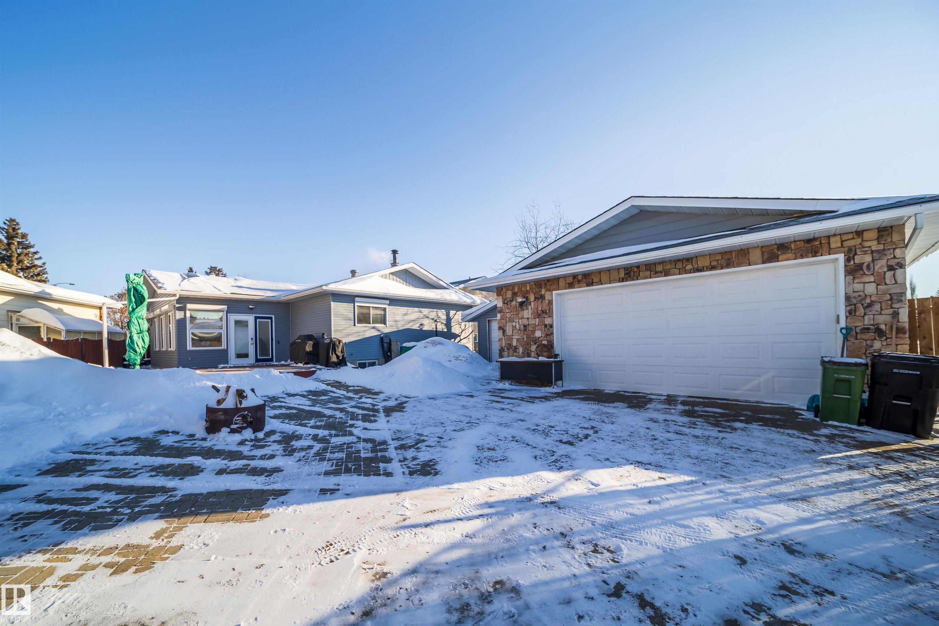 This 4 BED, 3 BATH BUNGALOW is on a quiet street, has OVER 2500 SqFt of finished living space and a LARGE BACK YARD! Walking distance to MENISA Elementary and Park. The spacious living room room is cozy with a gas fireplace and large bay window. Tons of oak cabinets, counter space and quality GE + BOSCH appliances in the kitchen, plus a breakfast nook and formal dining room. The ALL-SEASON SUNROOM is bright with tons of windows and skylights, and warmed by another gas fireplace. 3 generous bedrooms upstairs, with built-in closets, and the primary with 2pc ensuite bath. A huge recreation room downstairs with wood fireplace, 4th bedroom, bath with large shower, laundry room, tons of storage and potential for 5TH BEDROOM. The SOUTH FACING BACKYARD is perfect for entertaining with a large deck, patio stone and firepit. RV parking and a O/S DBL DETACHED HEATED GARAGE, plus storage shed. Upgrades include a newer roof, deck, A/C, and roll shutters. Close to parks and schools and easy access to Anthony Henday.