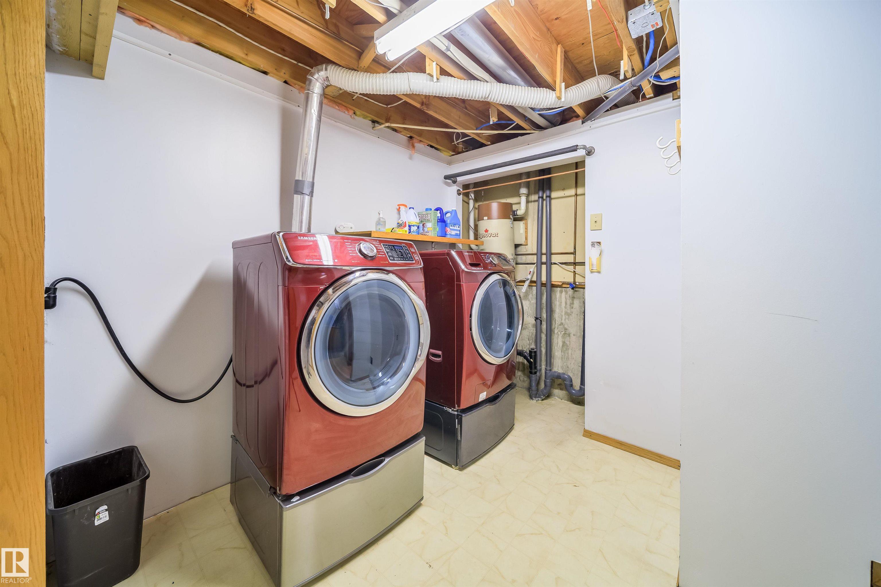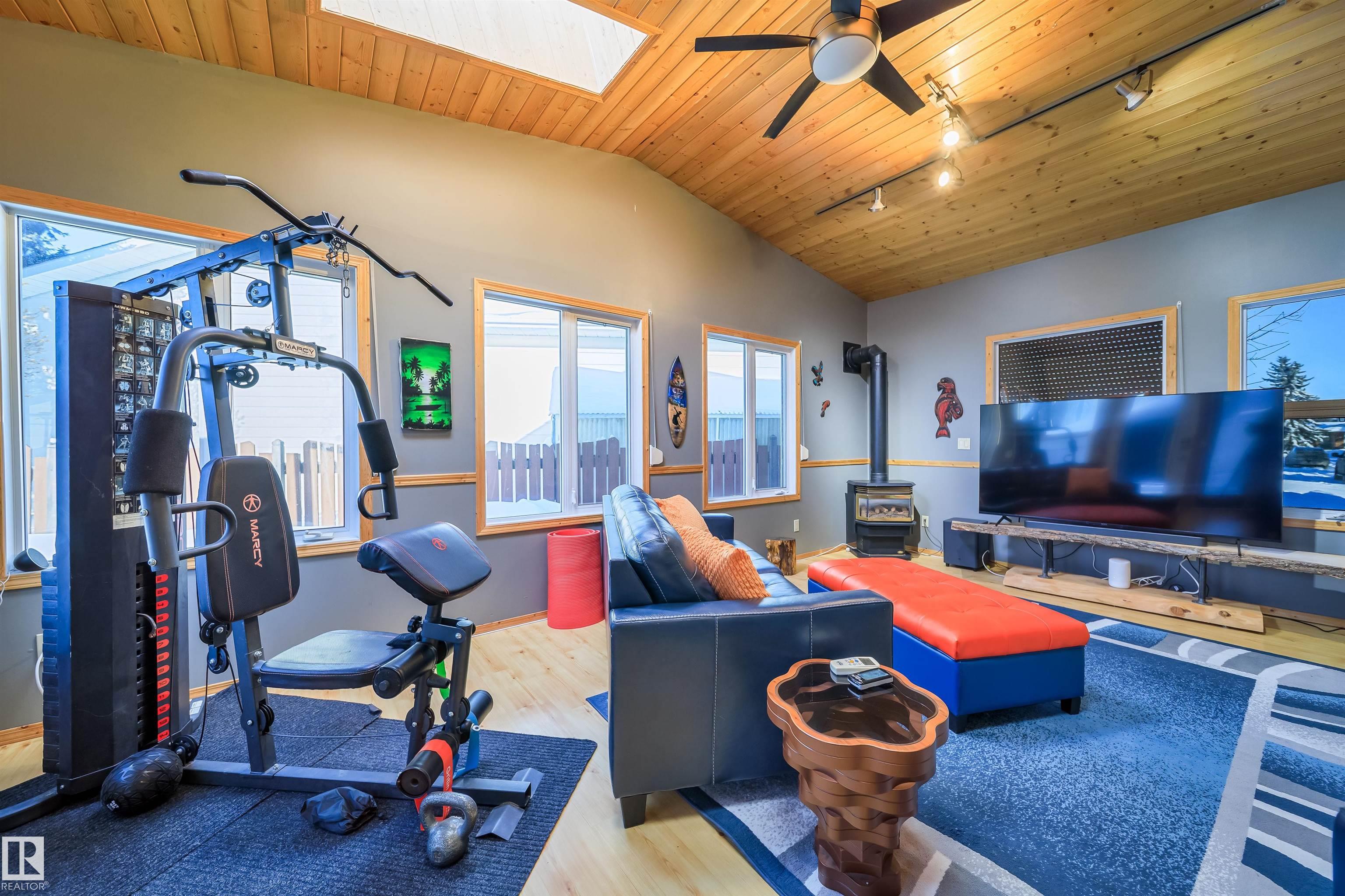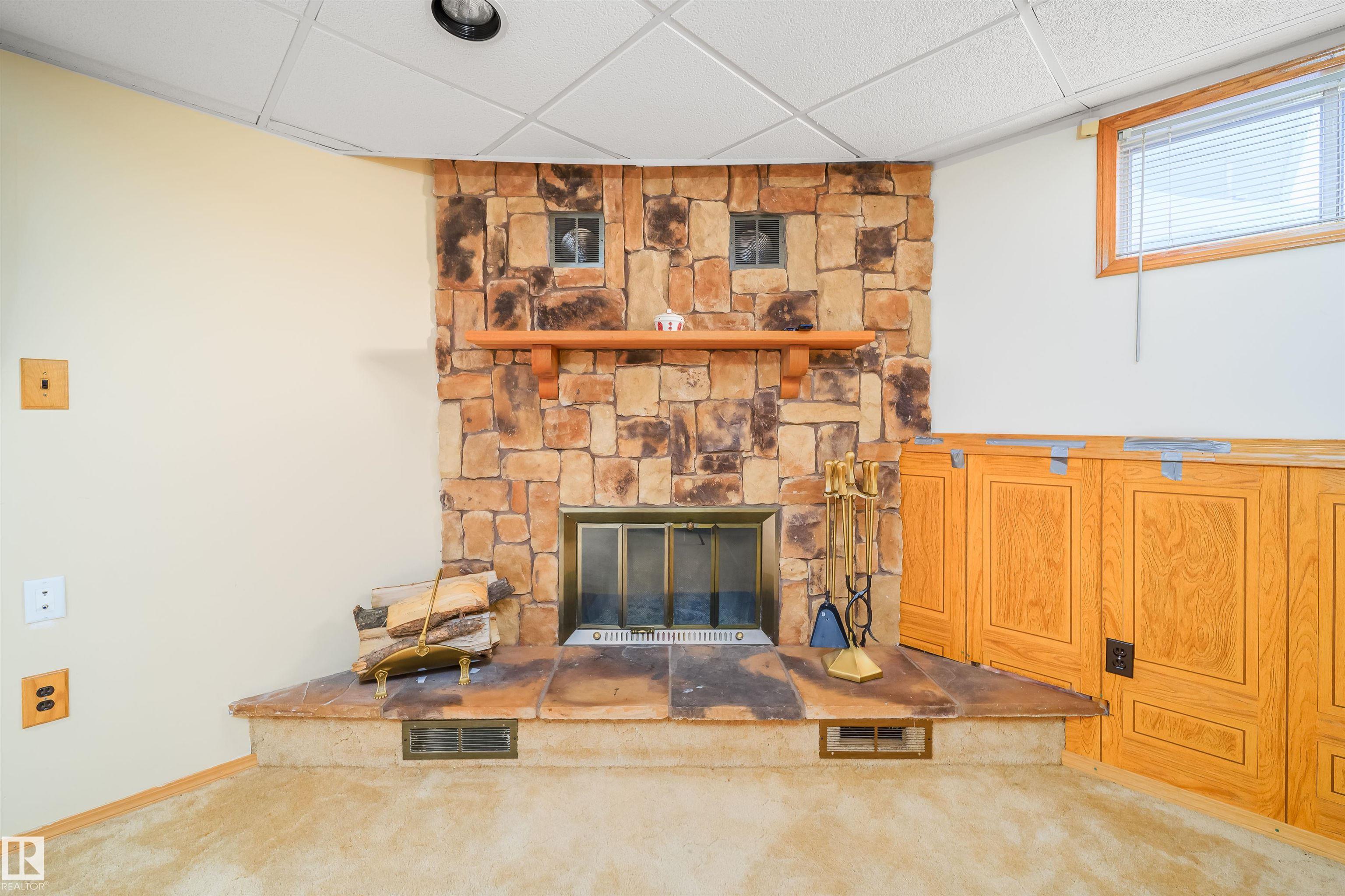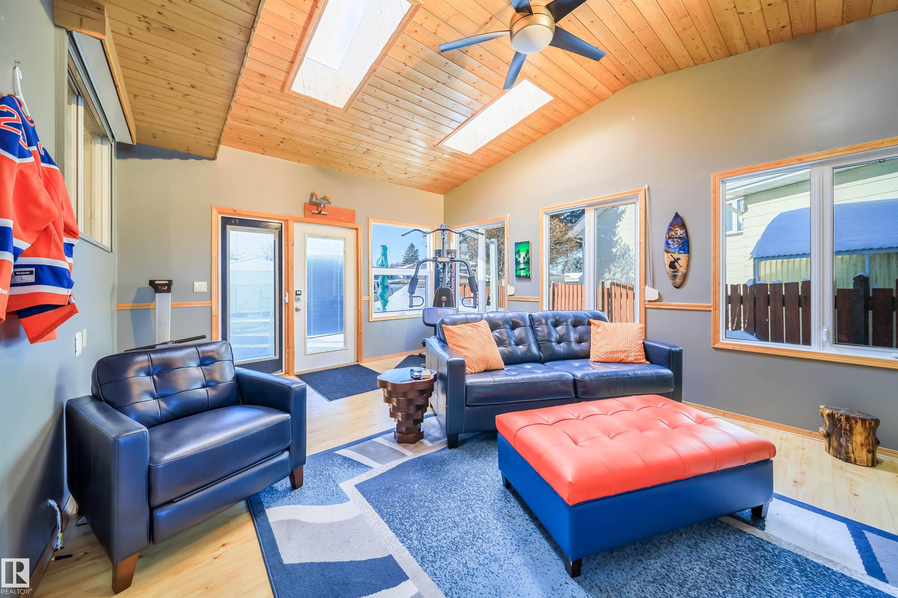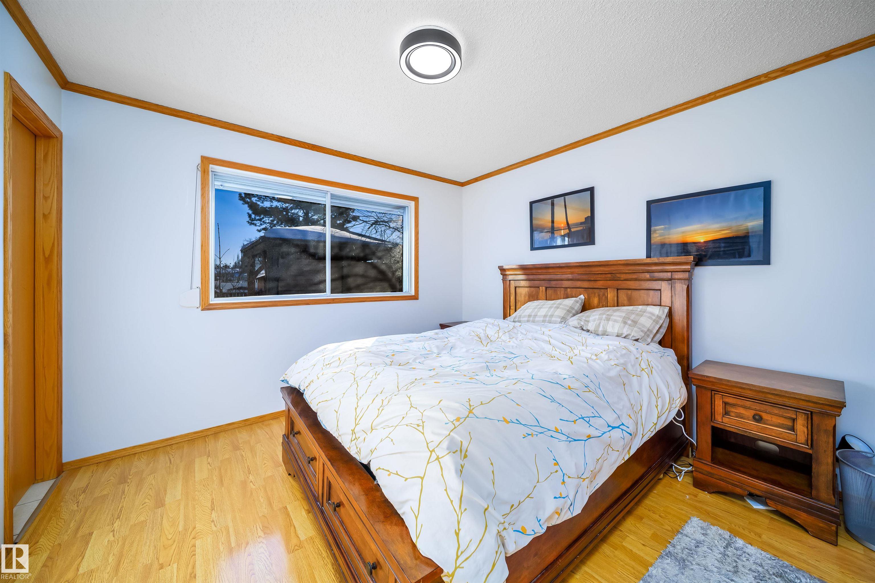 This 4 BED, 3 BATH BUNGALOW is on a quiet street, has OVER 2500 SqFt of finished living space and a LARGE BACK YARD! Walking distance to MENISA Elementary and Park. The spacious living room room is cozy with a gas fireplace and large bay window. Tons of oak cabinets, counter space and quality GE + BOSCH appliances in the kitchen, plus a breakfast nook and formal dining room. The ALL-SEASON SUNROOM is bright with tons of windows and skylights, and warmed by another gas fireplace. 3 generous bedrooms upstairs, with built-in closets, and the primary with 2pc ensuite bath. A huge recreation room downstairs with wood fireplace, 4th bedroom, bath with large shower, laundry room, tons of storage and potential for 5TH BEDROOM. The SOUTH FACING BACKYARD is perfect for entertaining with a large deck, patio stone and firepit. RV parking and a O/S DBL DETACHED HEATED GARAGE, plus storage shed. Upgrades include a newer roof, deck, A/C, and roll shutters. Close to parks and schools and easy access to Anthony Henday.