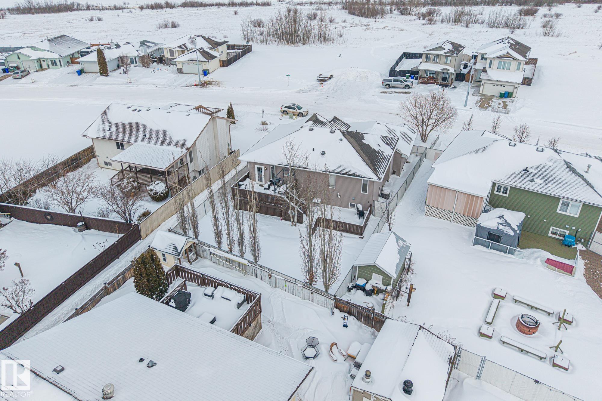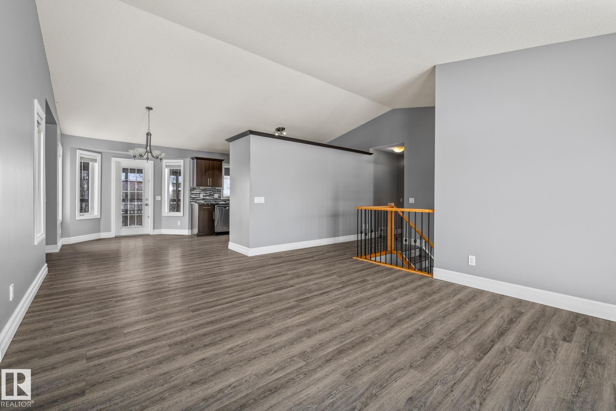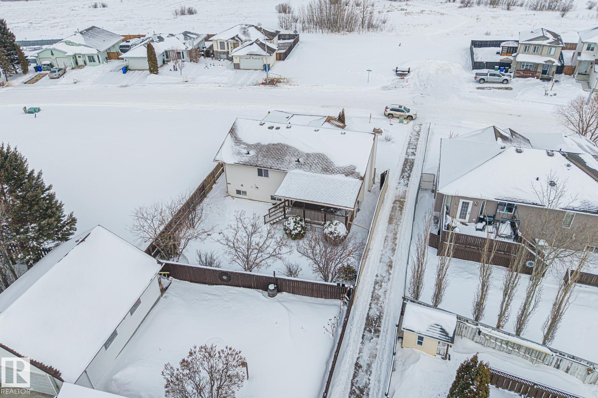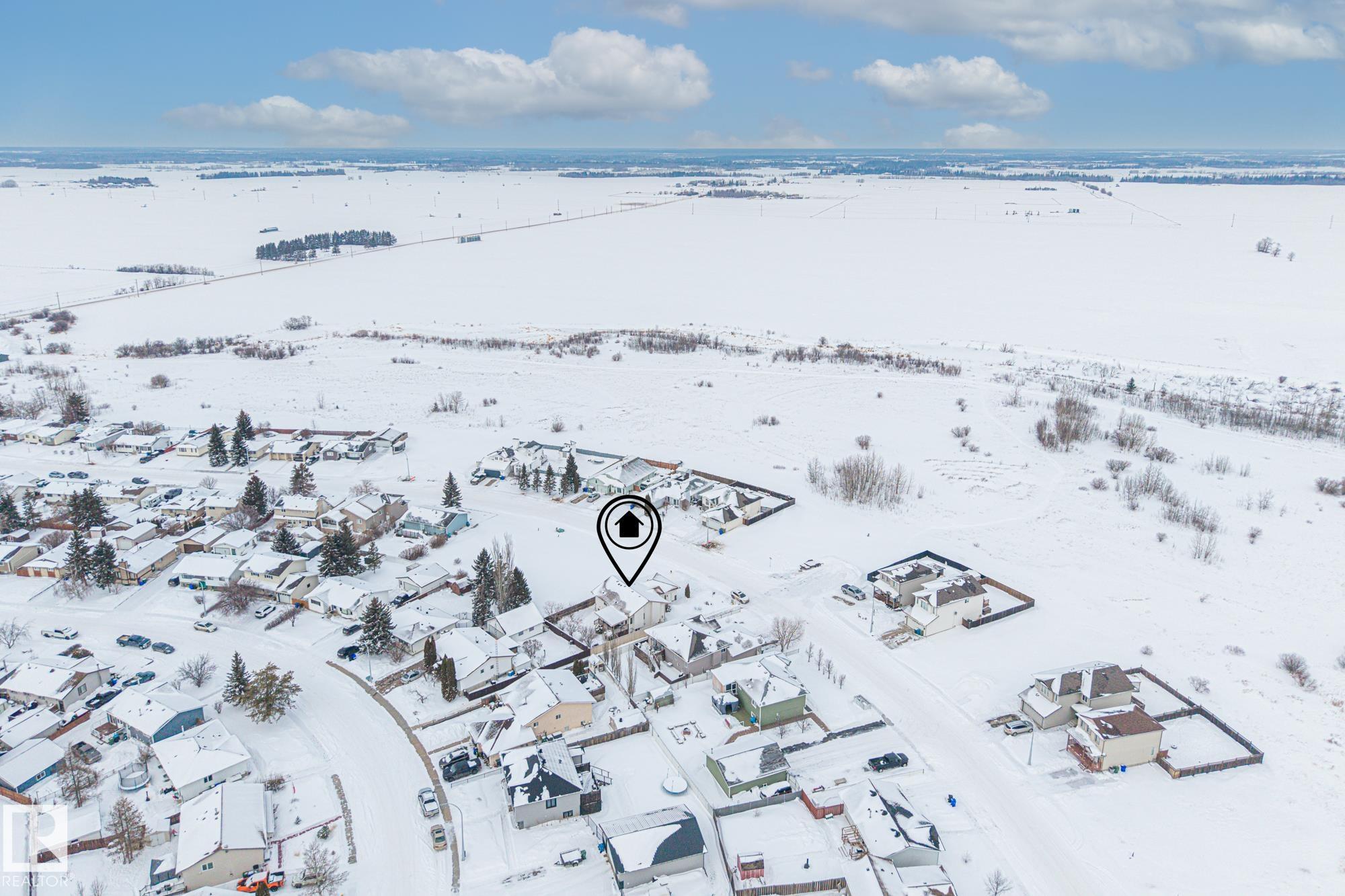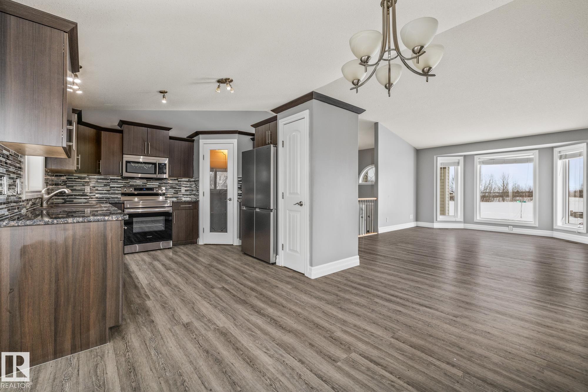 Spacious 4 Bed / 3 Bath Bi-Level offering 2,365 sq.ft. of finished living space and fresh paint throughout! This bright, open home features vaulted ceilings, hardwood and high-end laminate flooring, plus two large bay windows that fill the space with natural light. The functional open-concept main floor connects the living and dining areas to a well-sized kitchen complete with granite counters, oak cabinetry and two pantries. Garden doors lead to a re-modeled covered deck with under-deck storage, perfect for enjoying the 6,226 sq.ft. lot. The main level includes two generous bedrooms with walk-in closets, including a primary suite with 3-pc ensuite, plus a 4-pc guest bath. The fully finished lower level offers a large rec room with marble-surround gas fireplace, two additional bedrooms and another 3-pc bath. Oversized 24?x23? double garage with convenient access from both levels. No west neighbour (vacant lot), walkway to the east, and easy walk to Bruderheim School ? just 20 minutes to Fort Saskatchewan!