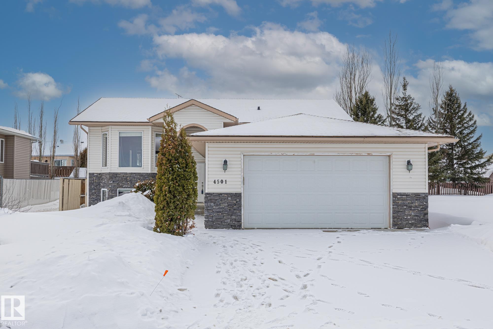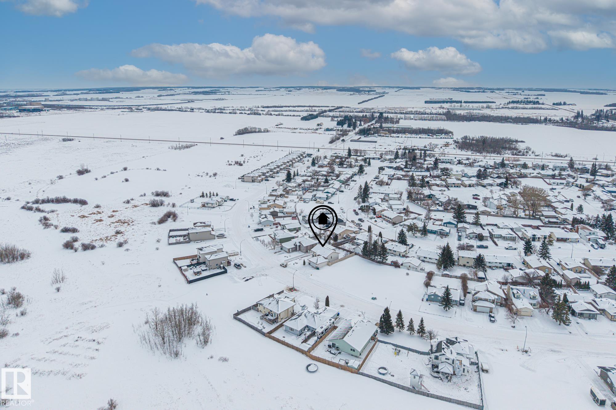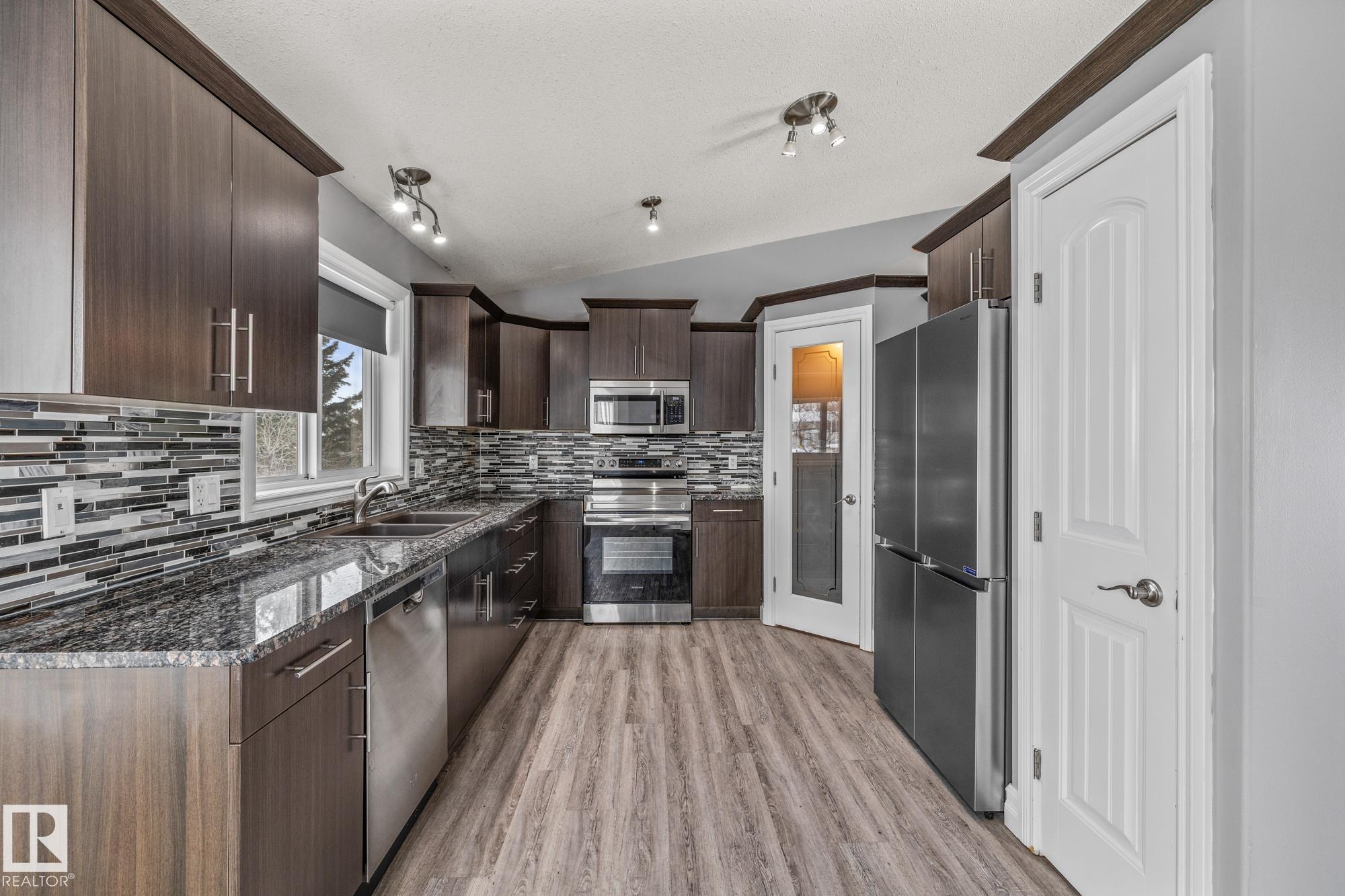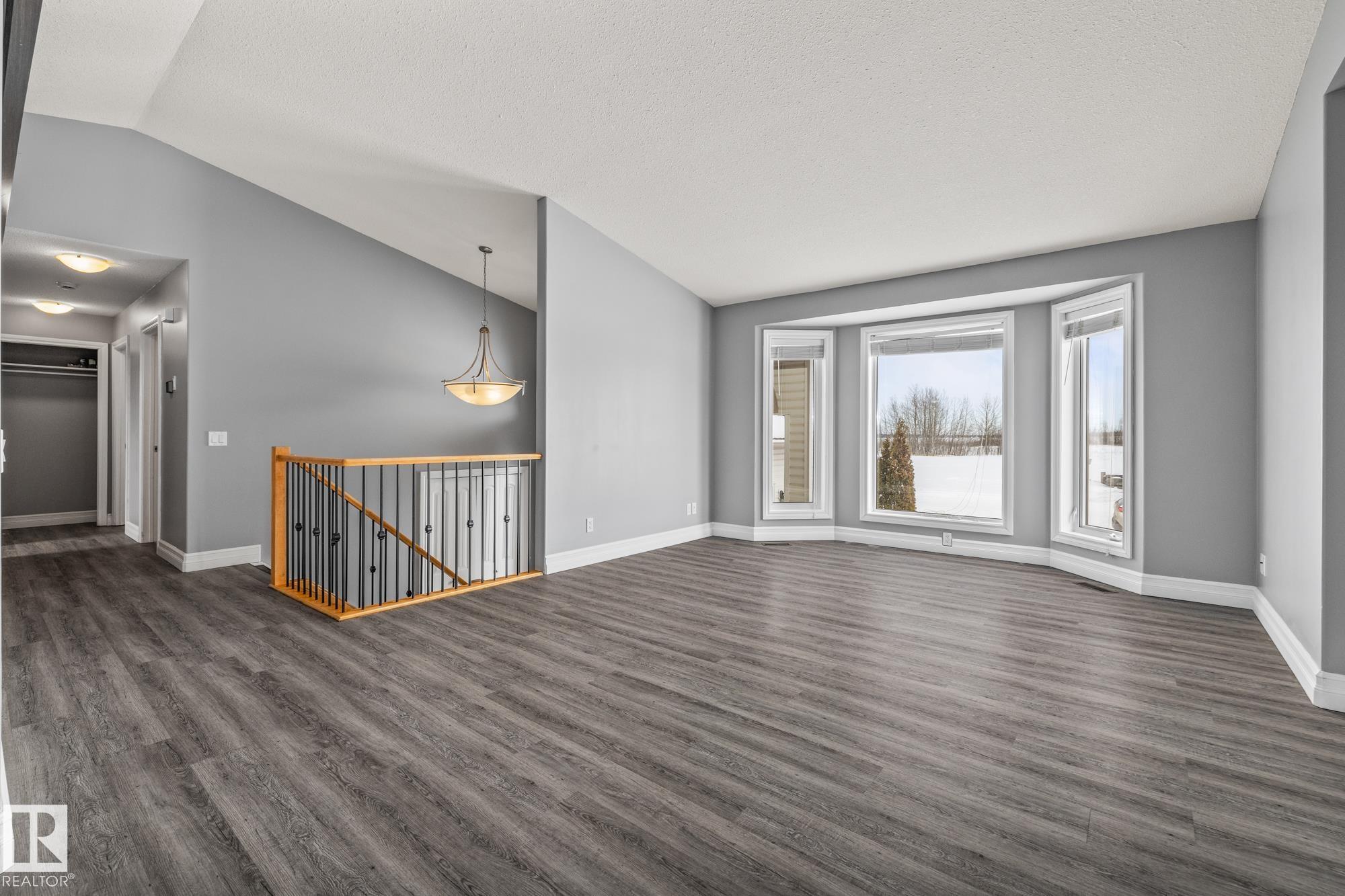 Spacious 4 Bed / 3 Bath Bi-Level offering 2,365 sq.ft. of finished living space and fresh paint throughout! This bright, open home features vaulted ceilings, hardwood and high-end laminate flooring, plus two large bay windows that fill the space with natural light. The functional open-concept main floor connects the living and dining areas to a well-sized kitchen complete with granite counters, oak cabinetry and two pantries. Garden doors lead to a re-modeled covered deck with under-deck storage, perfect for enjoying the 6,226 sq.ft. lot. The main level includes two generous bedrooms with walk-in closets, including a primary suite with 3-pc ensuite, plus a 4-pc guest bath. The fully finished lower level offers a large rec room with marble-surround gas fireplace, two additional bedrooms and another 3-pc bath. Oversized 24?x23? double garage with convenient access from both levels. No west neighbour (vacant lot), walkway to the east, and easy walk to Bruderheim School ? just 20 minutes to Fort Saskatchewan!