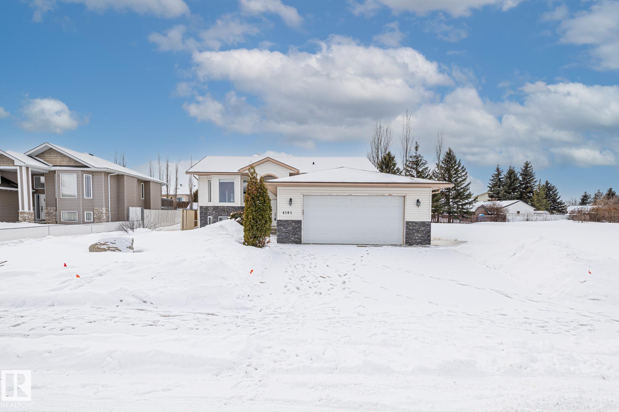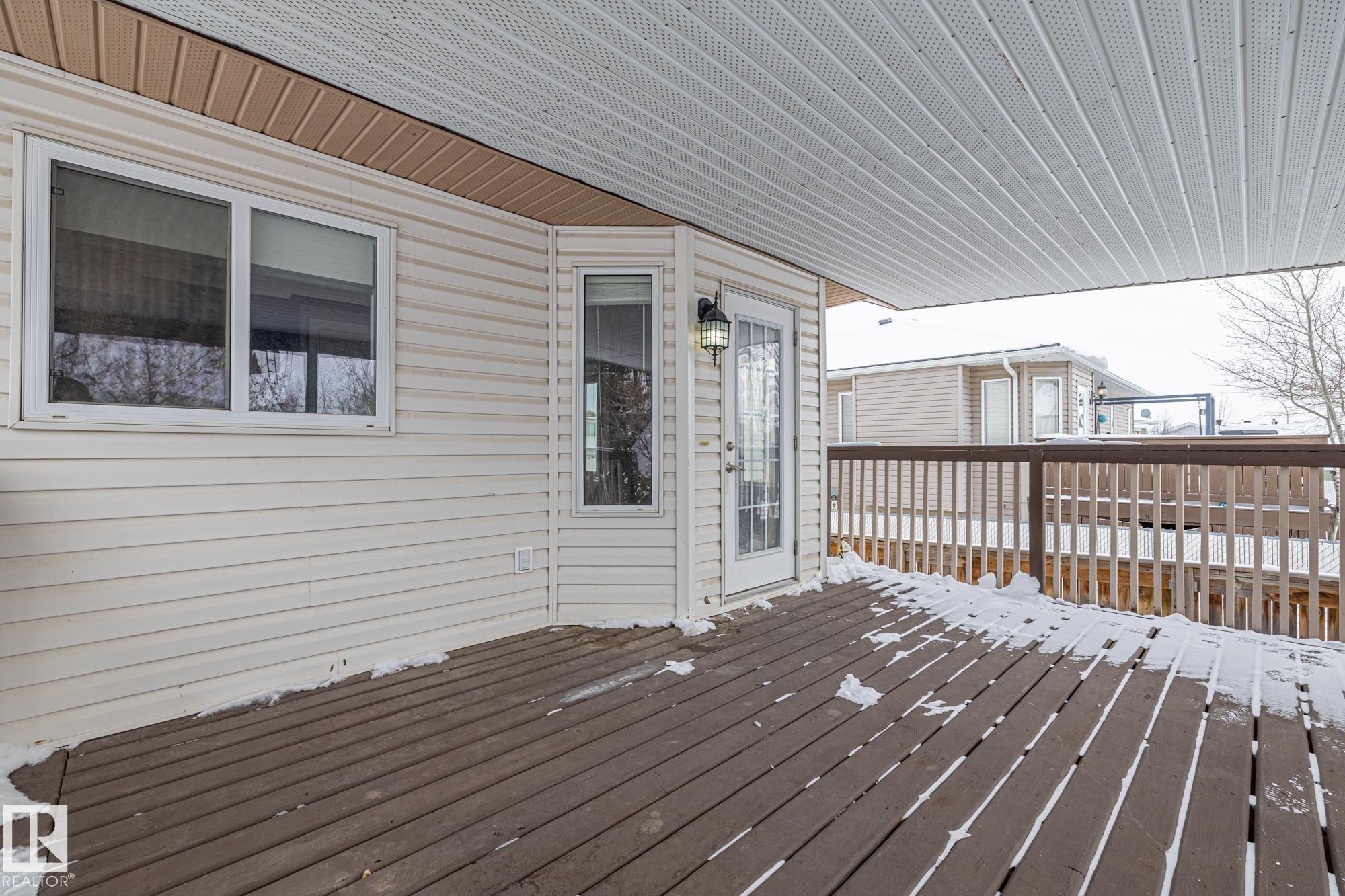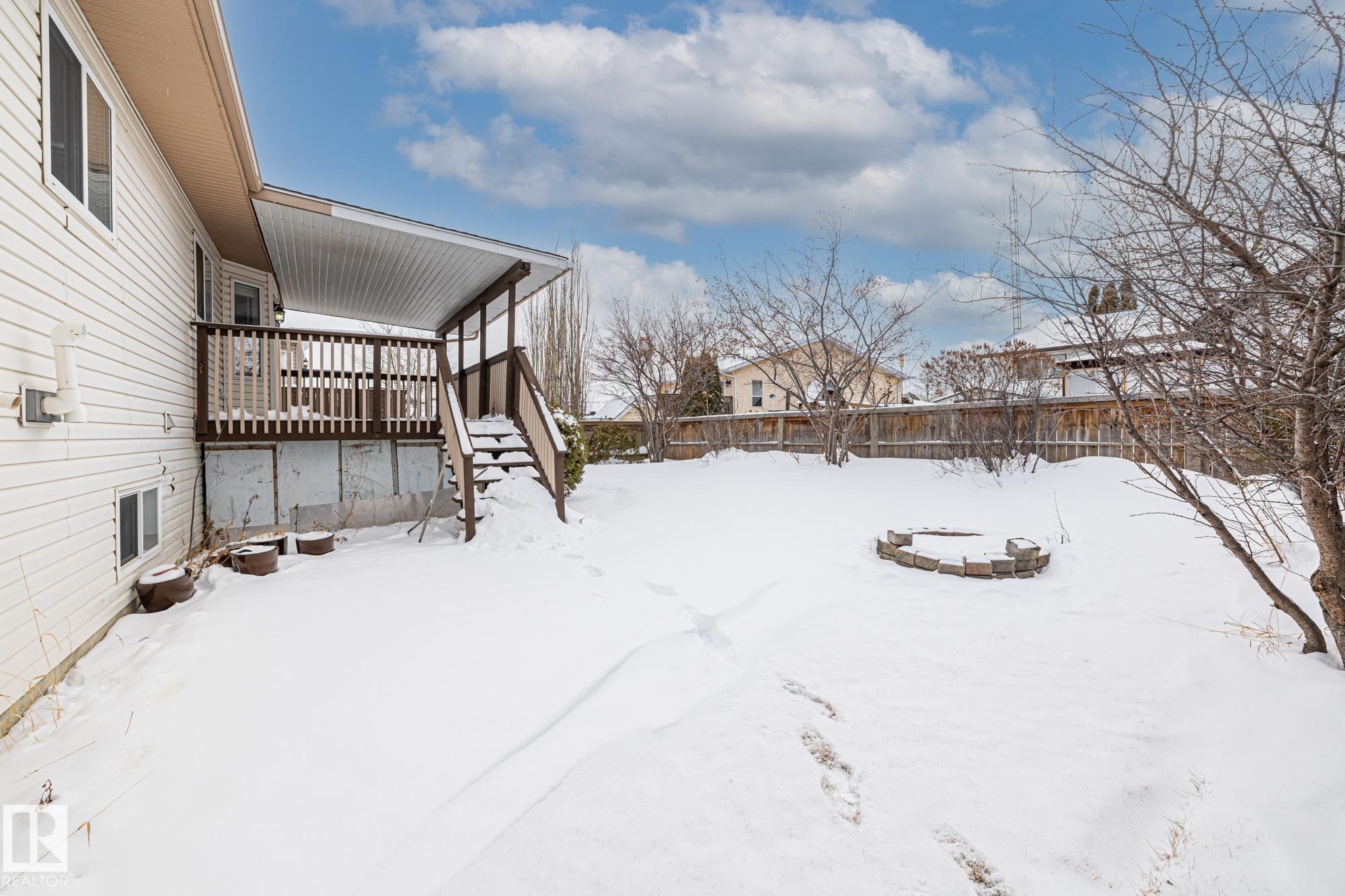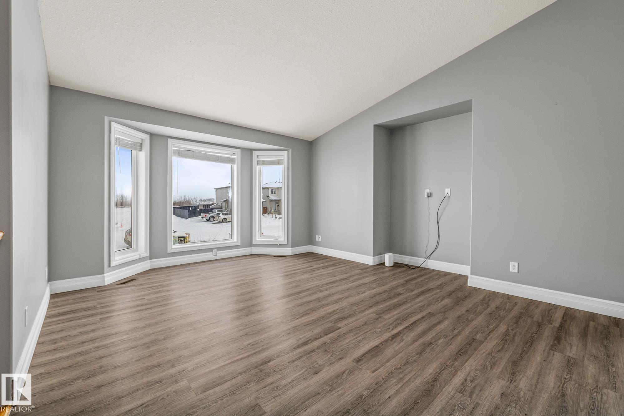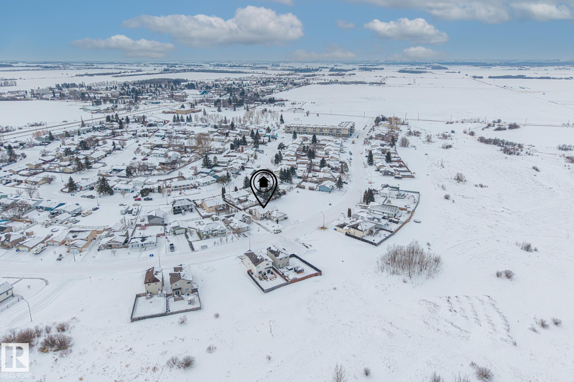 Spacious 4 Bed / 3 Bath Bi-Level offering 2,365 sq.ft. of finished living space and fresh paint throughout! This bright, open home features vaulted ceilings, hardwood and high-end laminate flooring, plus two large bay windows that fill the space with natural light. The functional open-concept main floor connects the living and dining areas to a well-sized kitchen complete with granite counters, oak cabinetry and two pantries. Garden doors lead to a re-modeled covered deck with under-deck storage, perfect for enjoying the 6,226 sq.ft. lot. The main level includes two generous bedrooms with walk-in closets, including a primary suite with 3-pc ensuite, plus a 4-pc guest bath. The fully finished lower level offers a large rec room with marble-surround gas fireplace, two additional bedrooms and another 3-pc bath. Oversized 24?x23? double garage with convenient access from both levels. No west neighbour (vacant lot), walkway to the east, and easy walk to Bruderheim School ? just 20 minutes to Fort Saskatchewan!