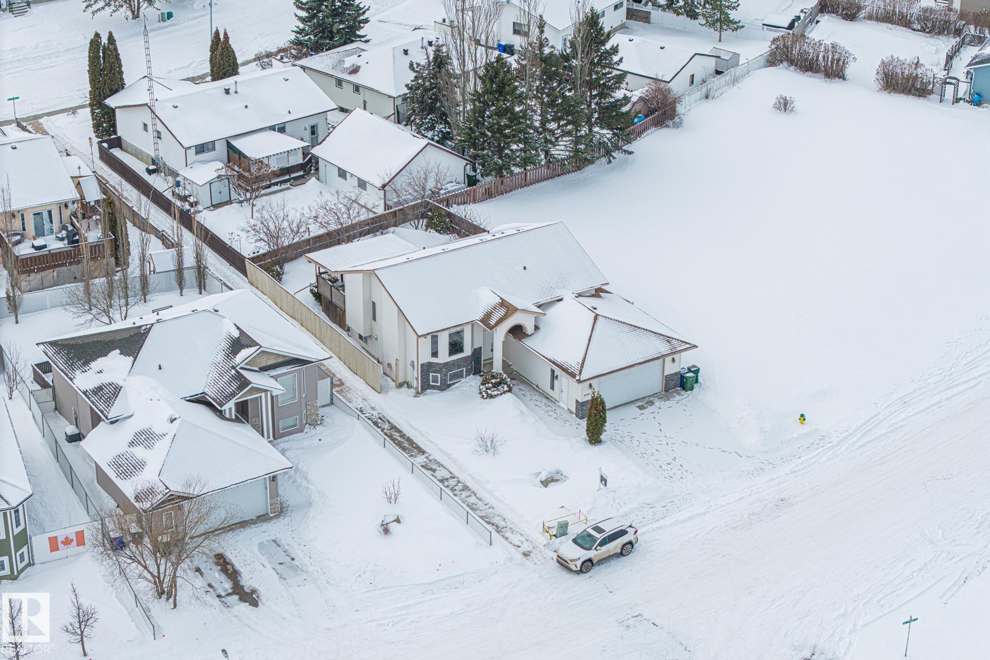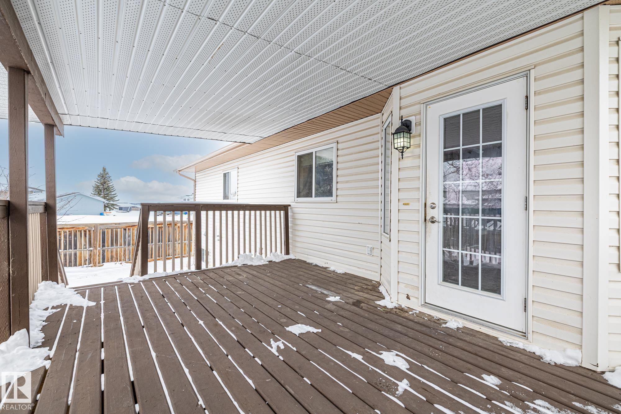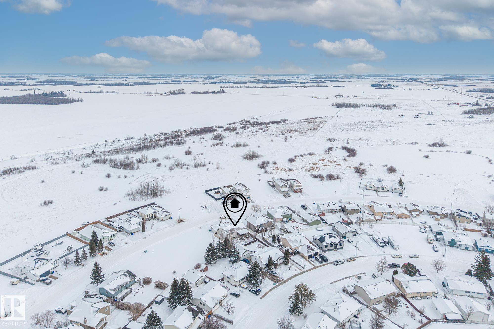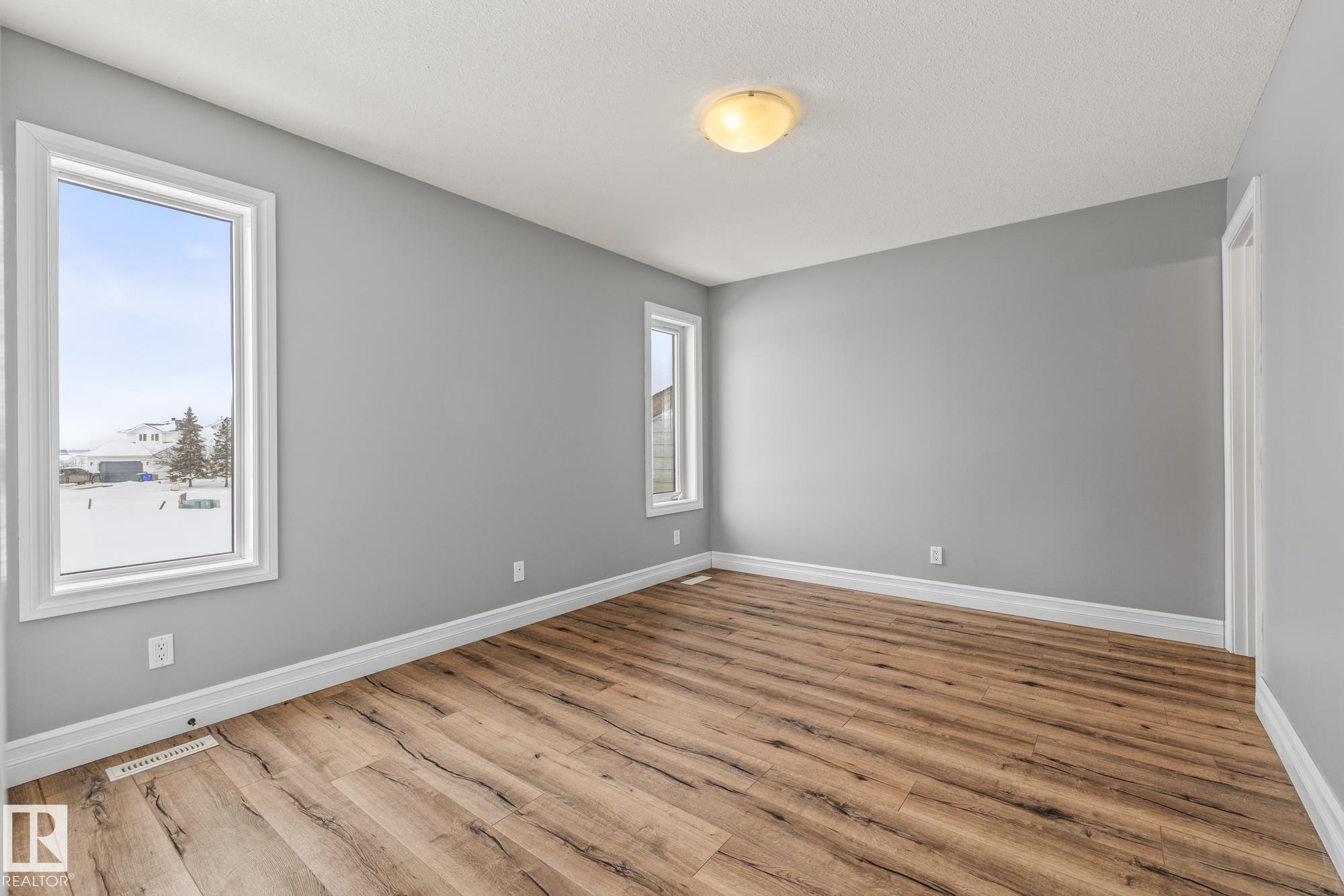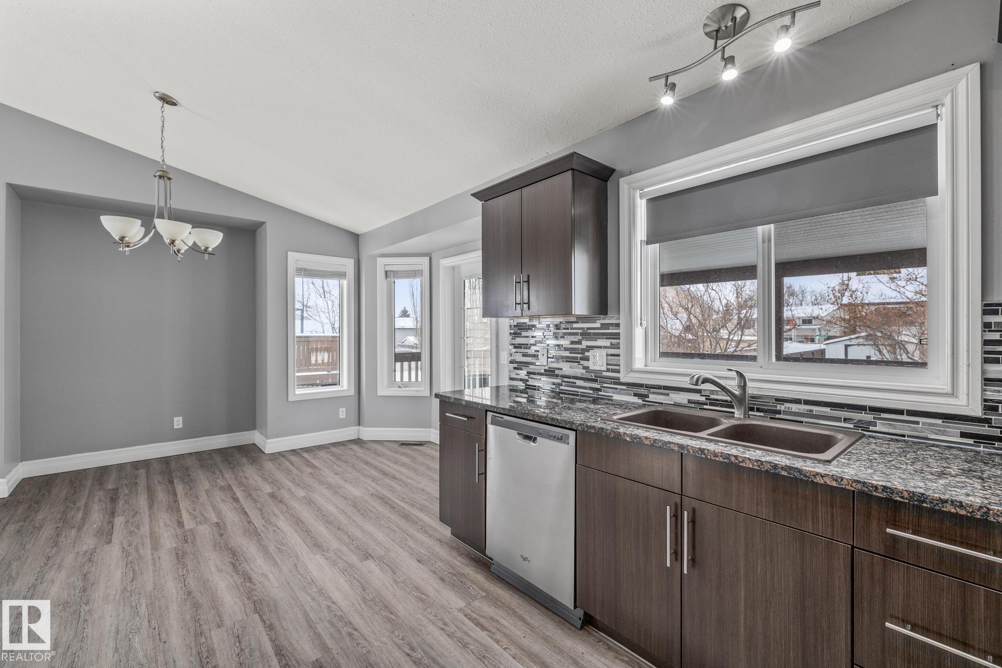 Spacious 4 Bed / 3 Bath Bi-Level offering 2,365 sq.ft. of finished living space and fresh paint throughout! This bright, open home features vaulted ceilings, hardwood and high-end laminate flooring, plus two large bay windows that fill the space with natural light. The functional open-concept main floor connects the living and dining areas to a well-sized kitchen complete with granite counters, oak cabinetry and two pantries. Garden doors lead to a re-modeled covered deck with under-deck storage, perfect for enjoying the 6,226 sq.ft. lot. The main level includes two generous bedrooms with walk-in closets, including a primary suite with 3-pc ensuite, plus a 4-pc guest bath. The fully finished lower level offers a large rec room with marble-surround gas fireplace, two additional bedrooms and another 3-pc bath. Oversized 24?x23? double garage with convenient access from both levels. No west neighbour (vacant lot), walkway to the east, and easy walk to Bruderheim School ? just 20 minutes to Fort Saskatchewan!