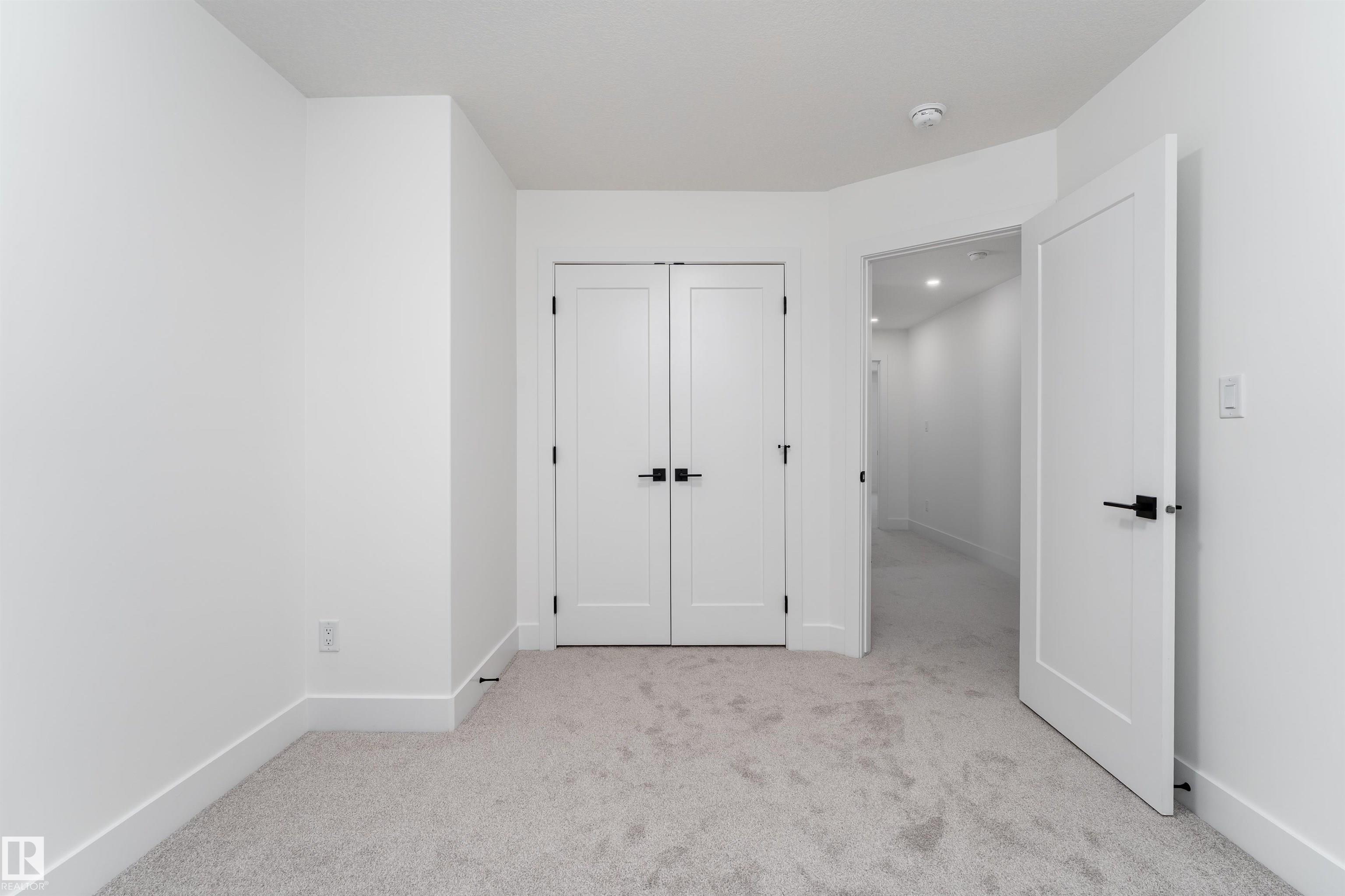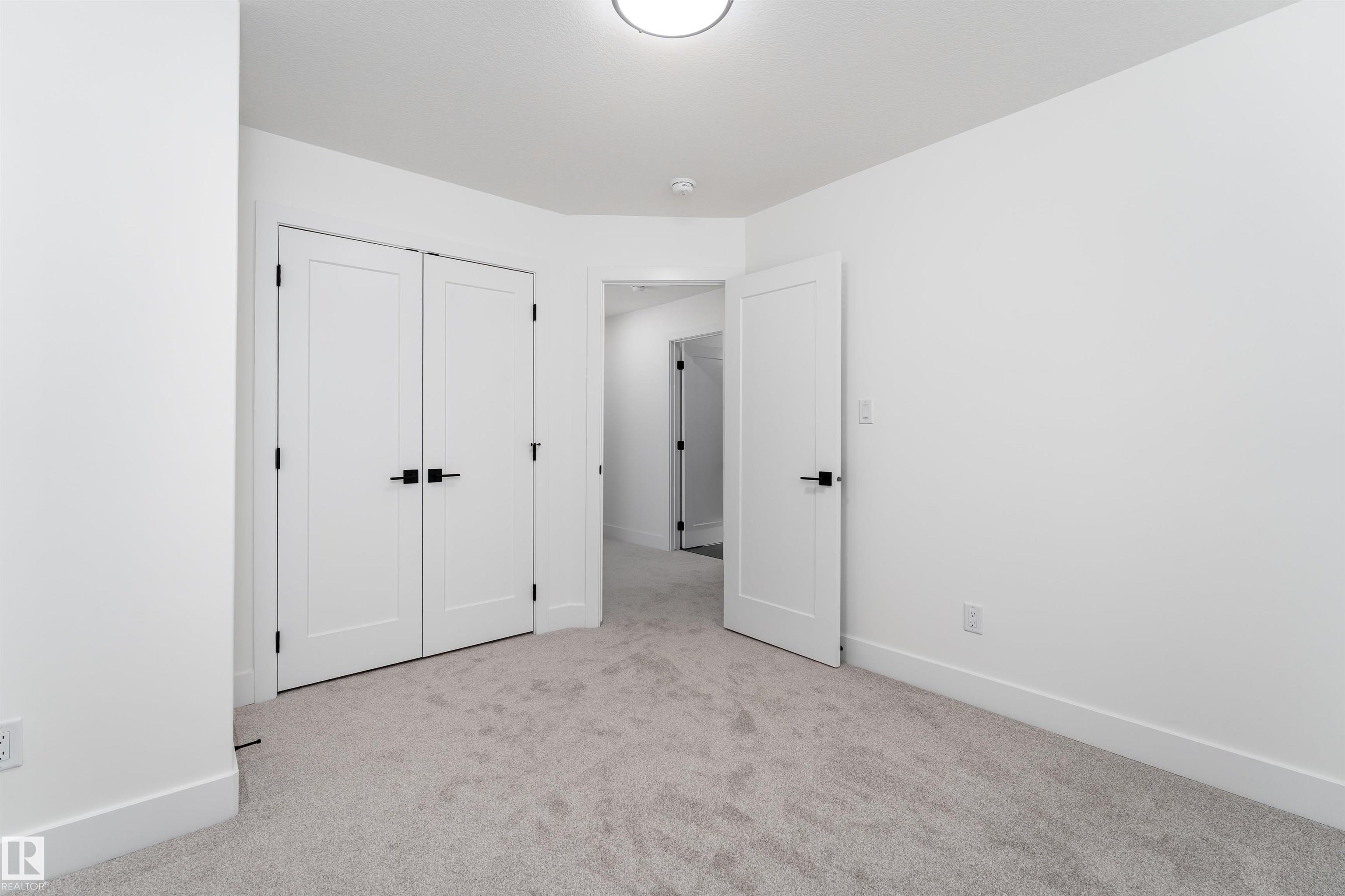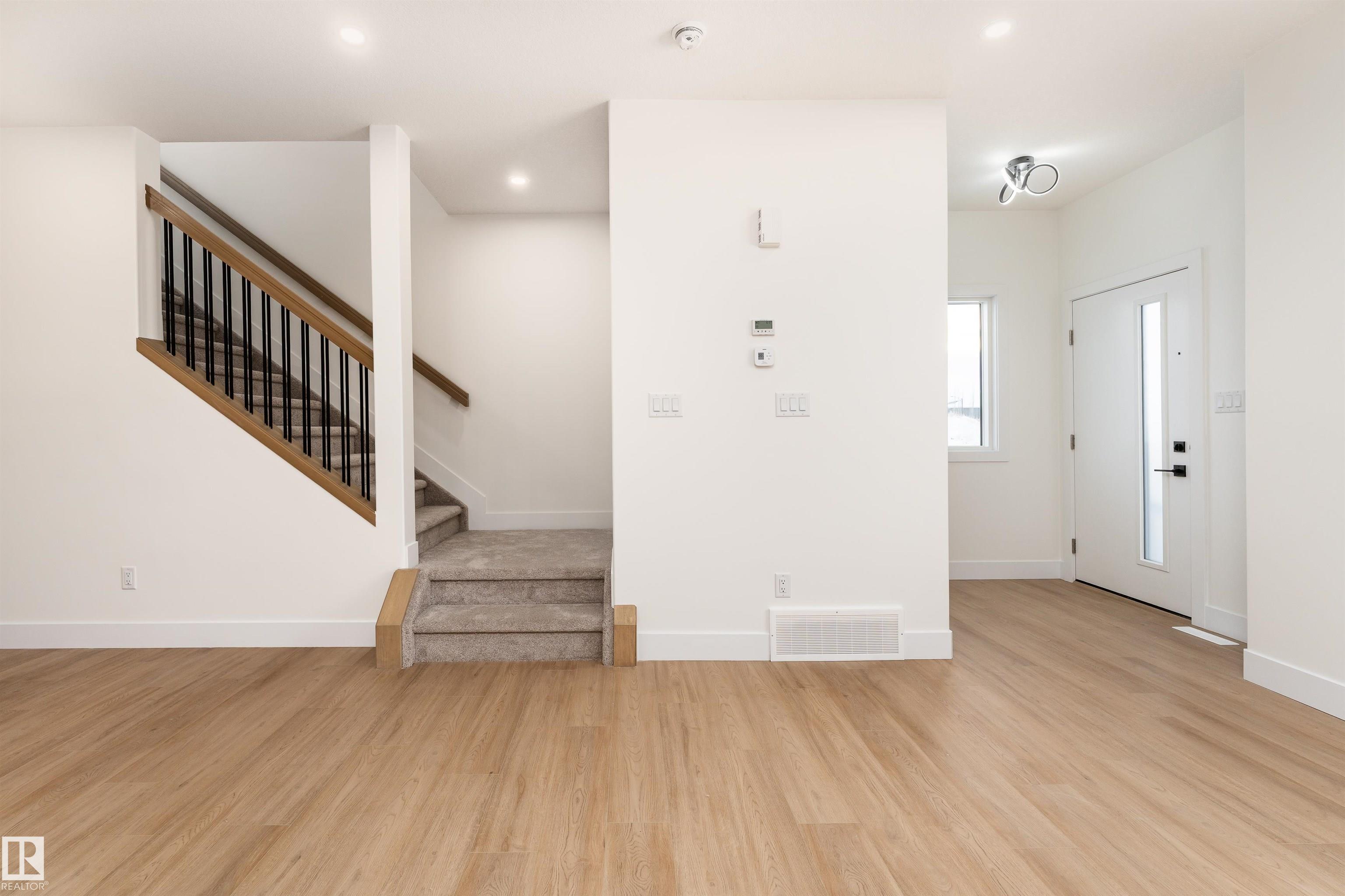 CORNER LOT in the desirable community of Starling. This move-in-ready half duplex offers 1,700 sq ft of living space with 3 bedrooms and 2.5 bathrooms. The open main floor features 9 ft ceilings and large windows that fill the home with natural light. The kitchen is designed for both function and style, with warm wood accents, a large island, and seamless flow into the living room, highlighted by a welcoming mantel fireplace. A main floor den provides flexibility for a home office or extra living space, while the separate side entrance adds convenience and future potential. Upstairs, the primary suite includes a spacious walk-in closet and a 5-piece ensuite with dual sinks. Located close to schools, shopping, parks, walking trails, and Glendale Golf & Country Club, this home offers an excellent west Edmonton lifestyle.