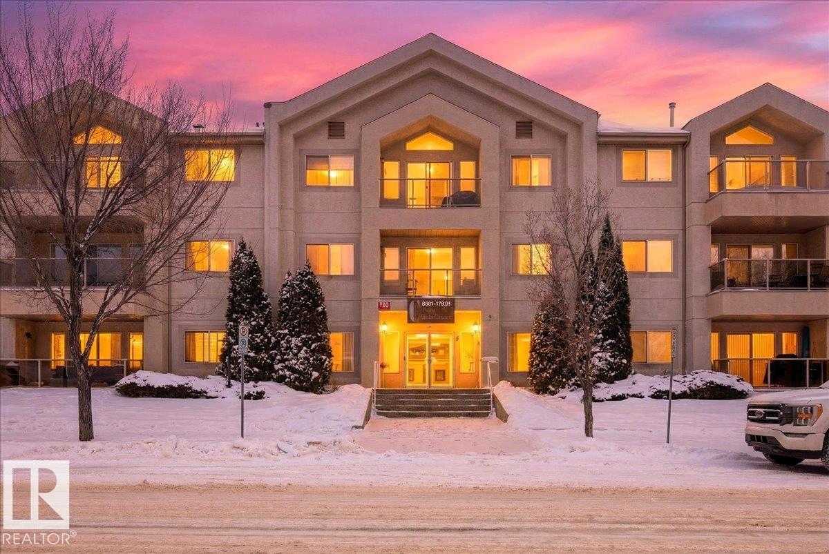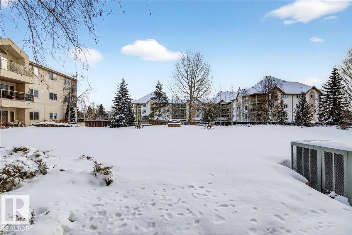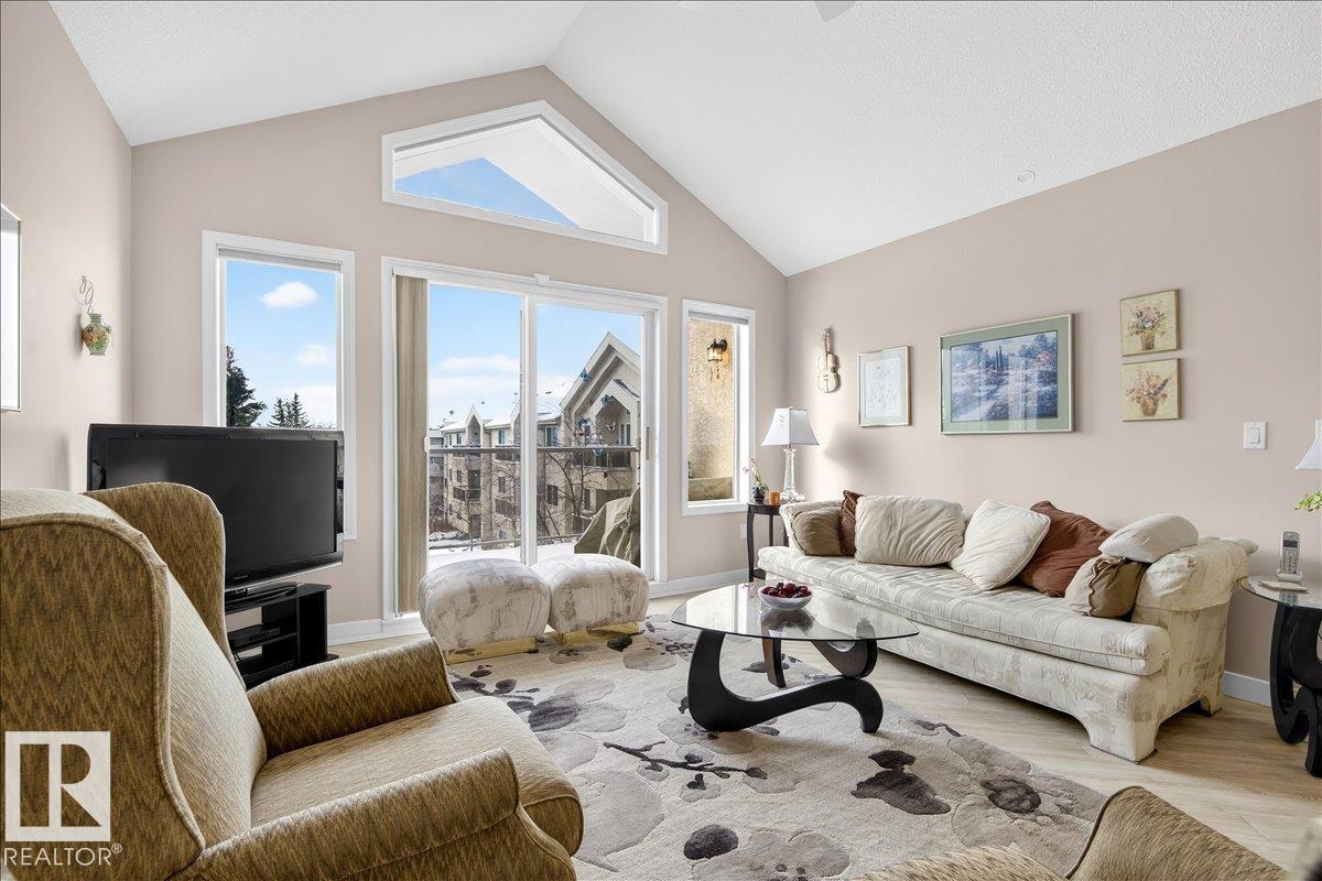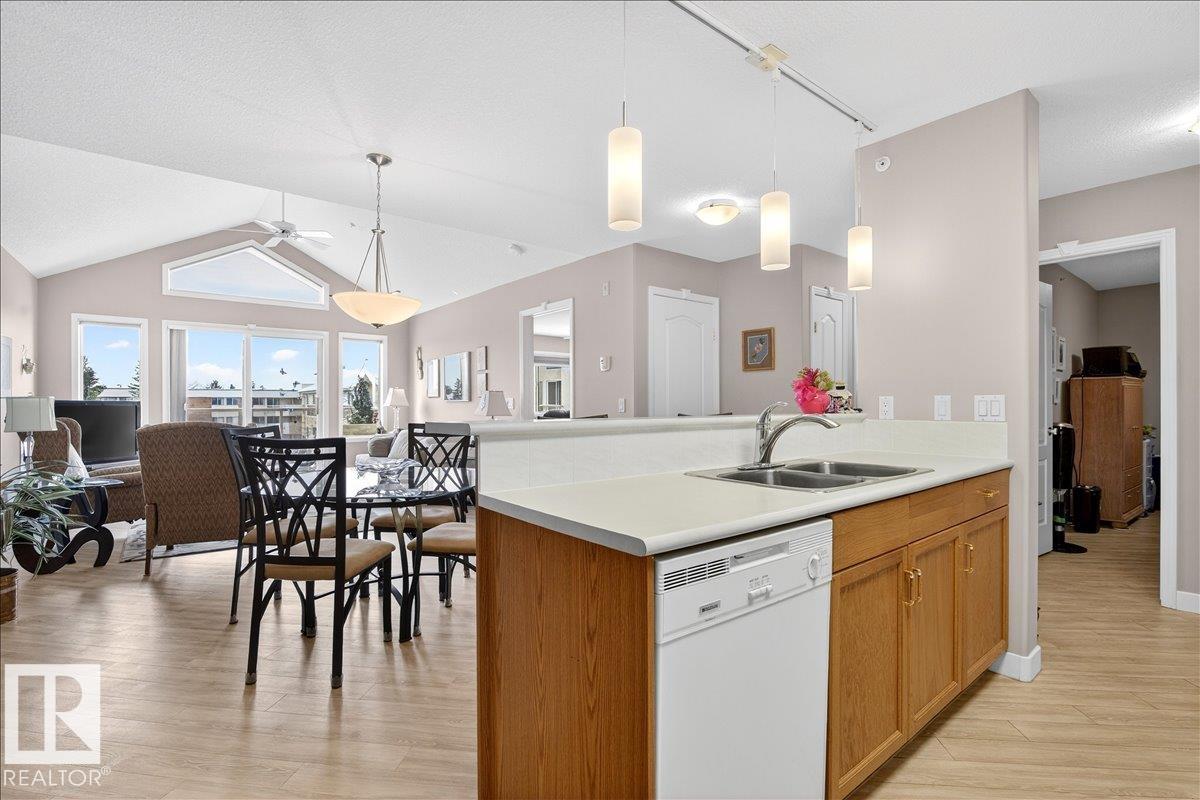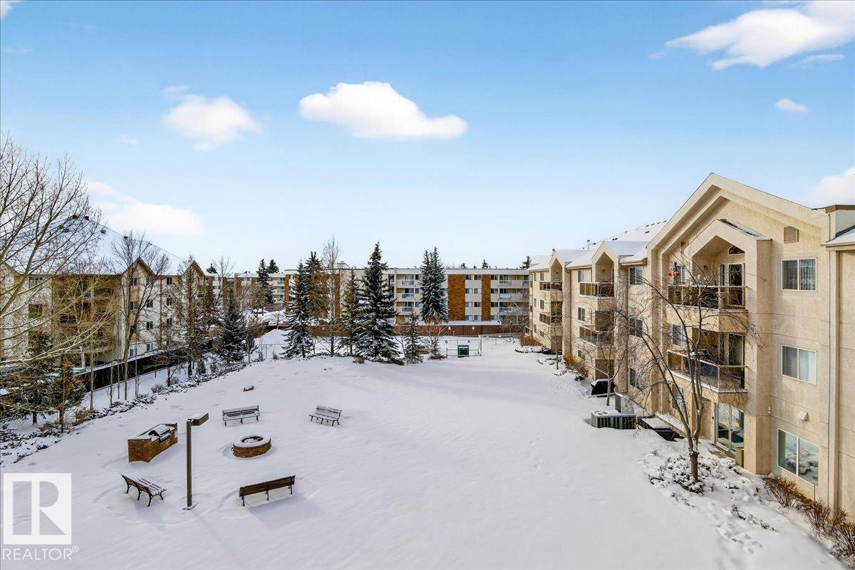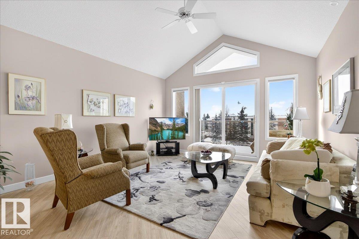 Experience luxury 55+ living in this beautifully appointed top-floor 1 bedroom + den, 1 bathroom condo at Country Club Court in Callingwood! Soaring vaulted ceilings create a bright, airy yet cozy atmosphere you?ll love coming home to, complemented by in-floor heating throughout the entire building for year-round comfort. Step onto your private deck overlooking the tranquil courtyard?an ideal setting for morning coffee or evening unwinding. The spacious den offers flexibility for a home office, reading nook, or guest space. Enjoy exceptional amenities including underground parking with car wash, a fully equipped fitness room with sauna, woodworking shop, and an inviting social room for gatherings. Perfectly located near shopping, transit, and everyday conveniences, this well-managed building offers comfort, community, and low-maintenance living in desirable Callingwood.